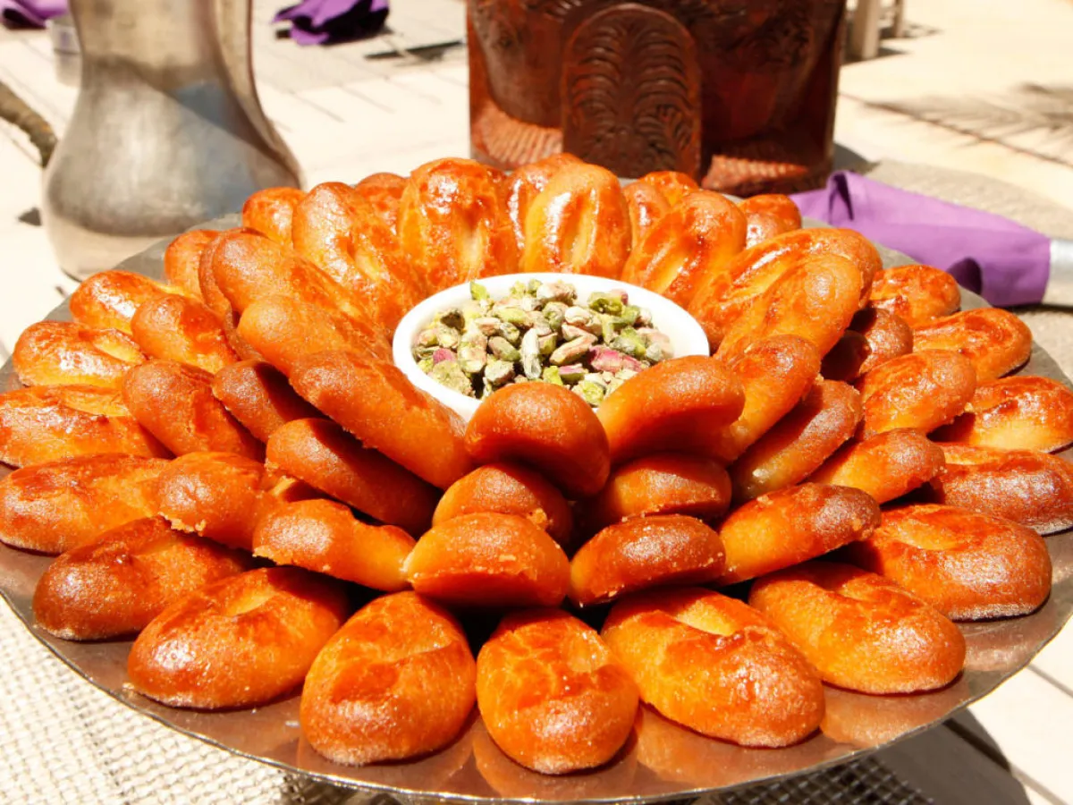 3 ـ بعد الفراغ من الخفق، تقطّع هذه العجينة إلى قطع متساوية، وتوضع في صينيّة الفرن، وتخبز على حرارة 275 درجة مئويّة، وذلك لمدّة 20 دقيقة، حتى تحمرّ.