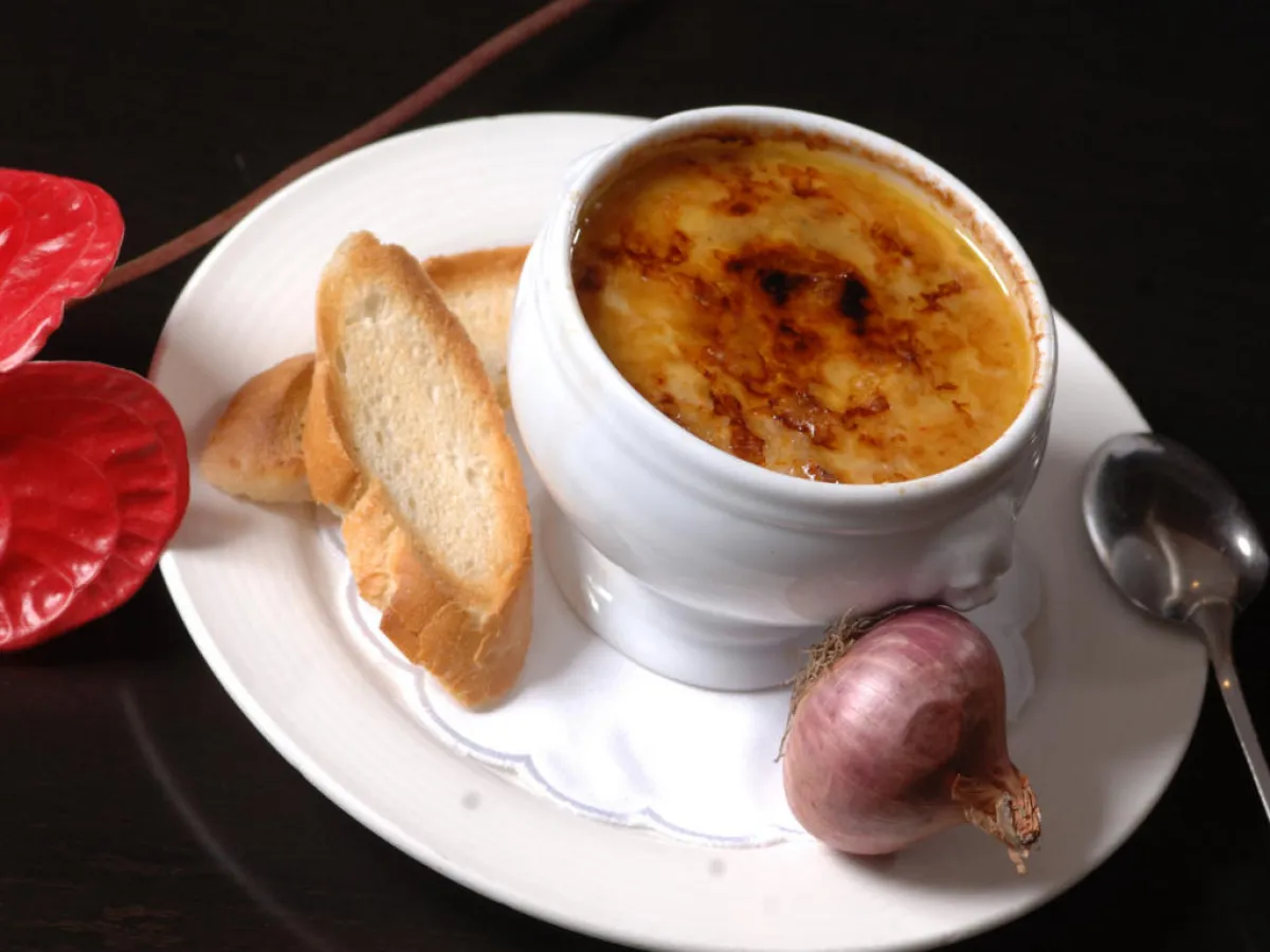 4 ـ عند التقديم، يُصبّ الحساء ويُغطّى بالخبز الفرنسيّ وصنفي الجبن. ويحمّر في الفرن حتّى تكوّن الجبنة قشرة ذهبية.