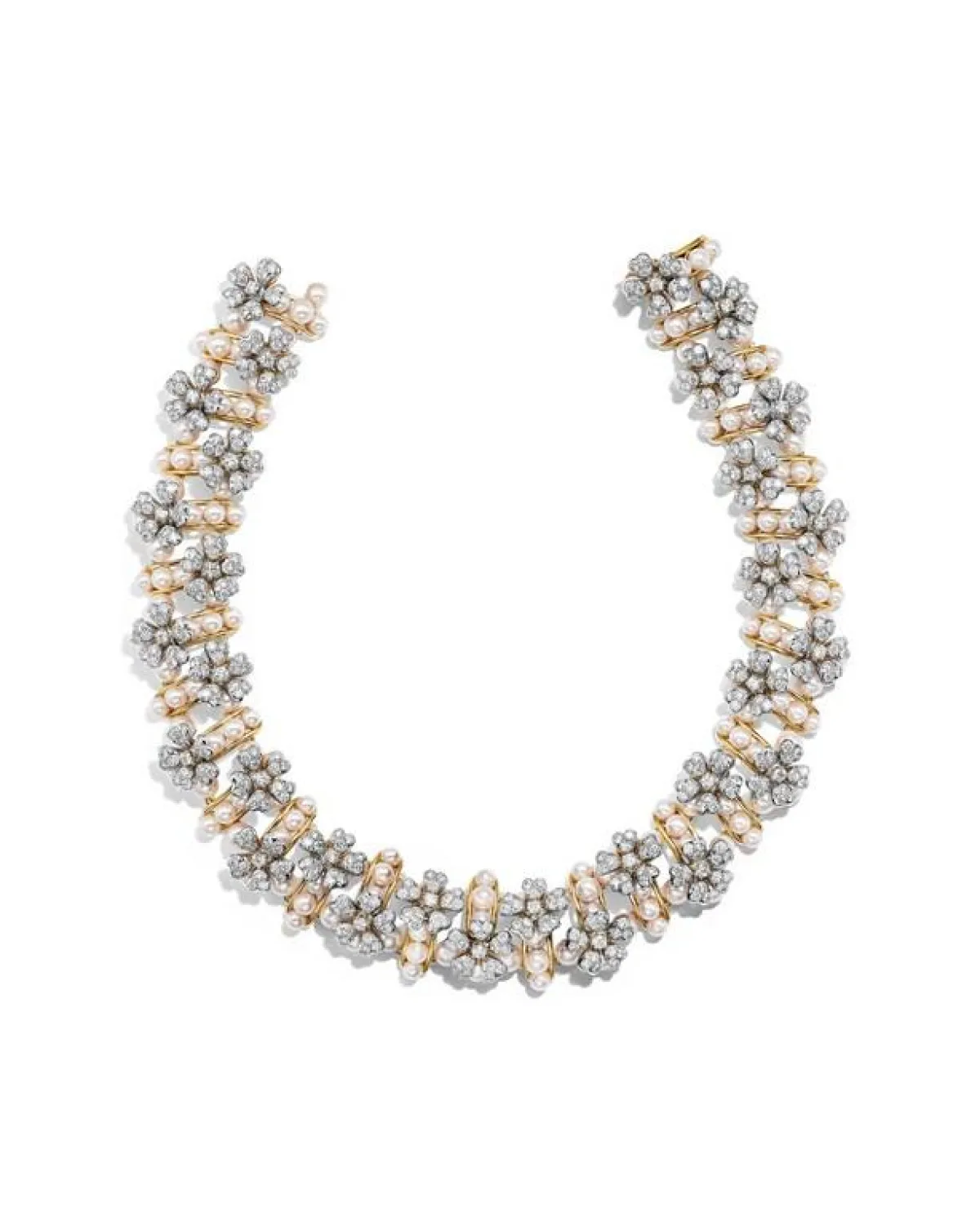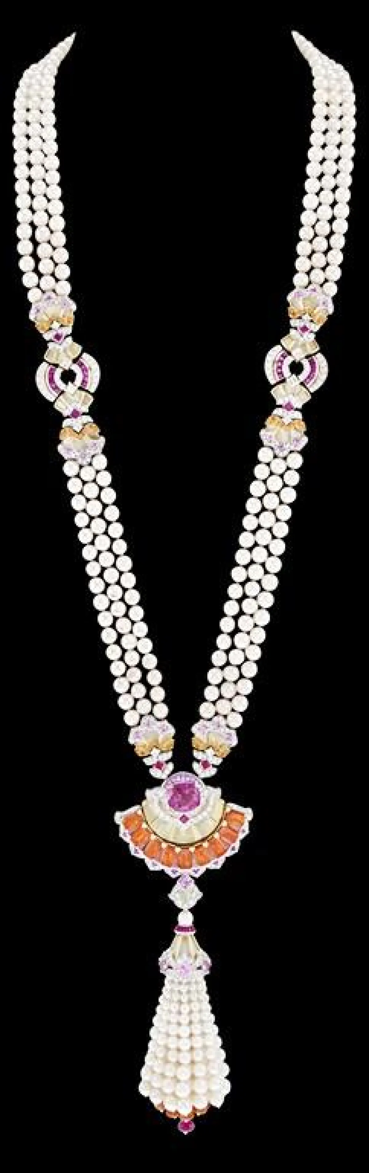 ومن قطع المجوهرات التي سحرتنا أيضاً، عقد فيستا Festa الذي قدّمتها دار بولغري Bulgari وهو يتميز بتصميمه المعقّد، مصنوع من الذهب الأبيض ومرصّع بأحجار اللؤلؤ والسافير والزمرد.
