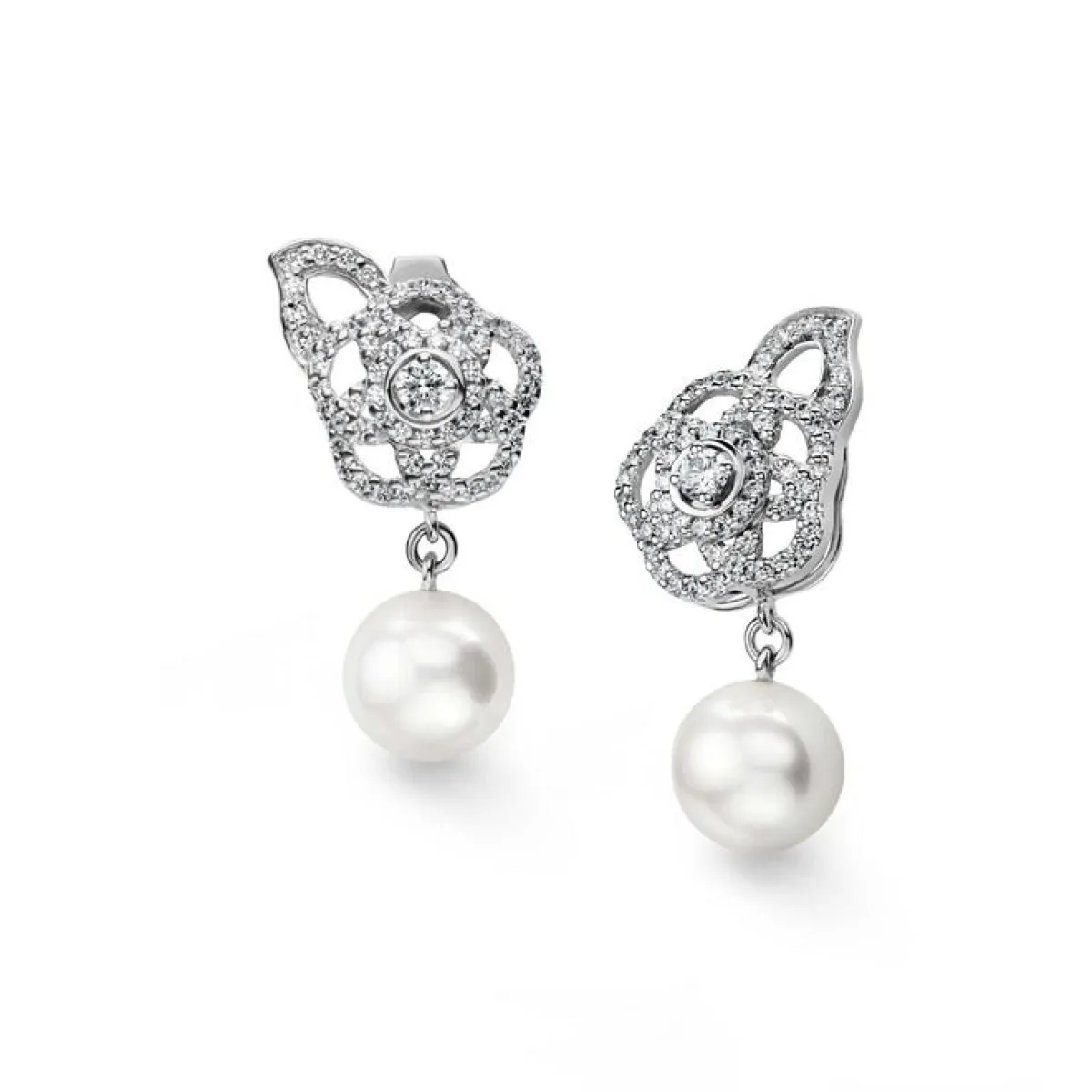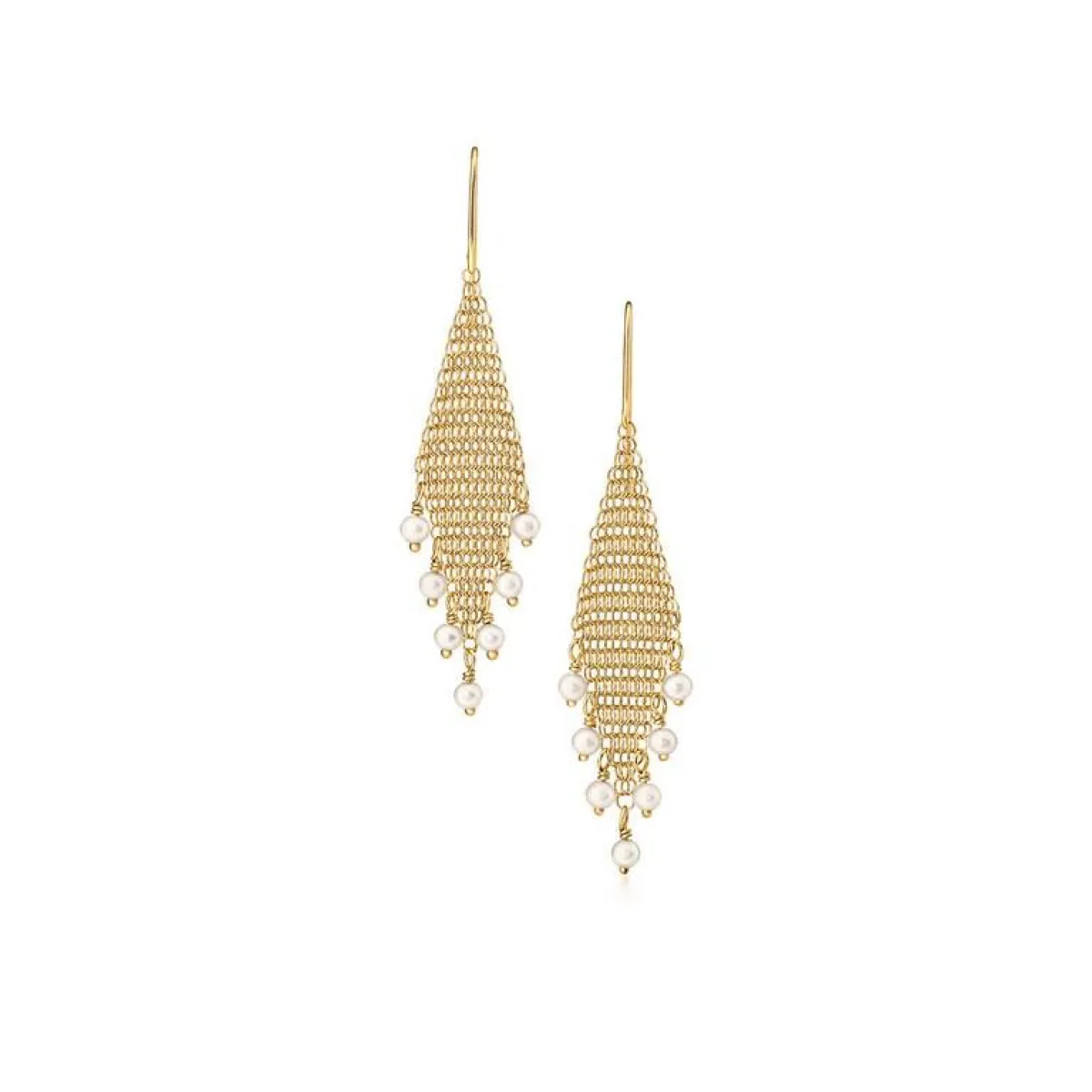 كما بإمكانك أن تتألقي بأقراط ميش فرينج Mesh Fringe من تيفاني أند كو. Tiffany&Co. بتصميمها المتدلي والساحر وهي أيضاً مصنوعة من الذهب الأصفر ومرصّعة بحبيبات اللؤلؤ البيضاء. وهي قطعة مجوهرات ثمينة لها تأثير أنثوي مبهر على طلّتك.