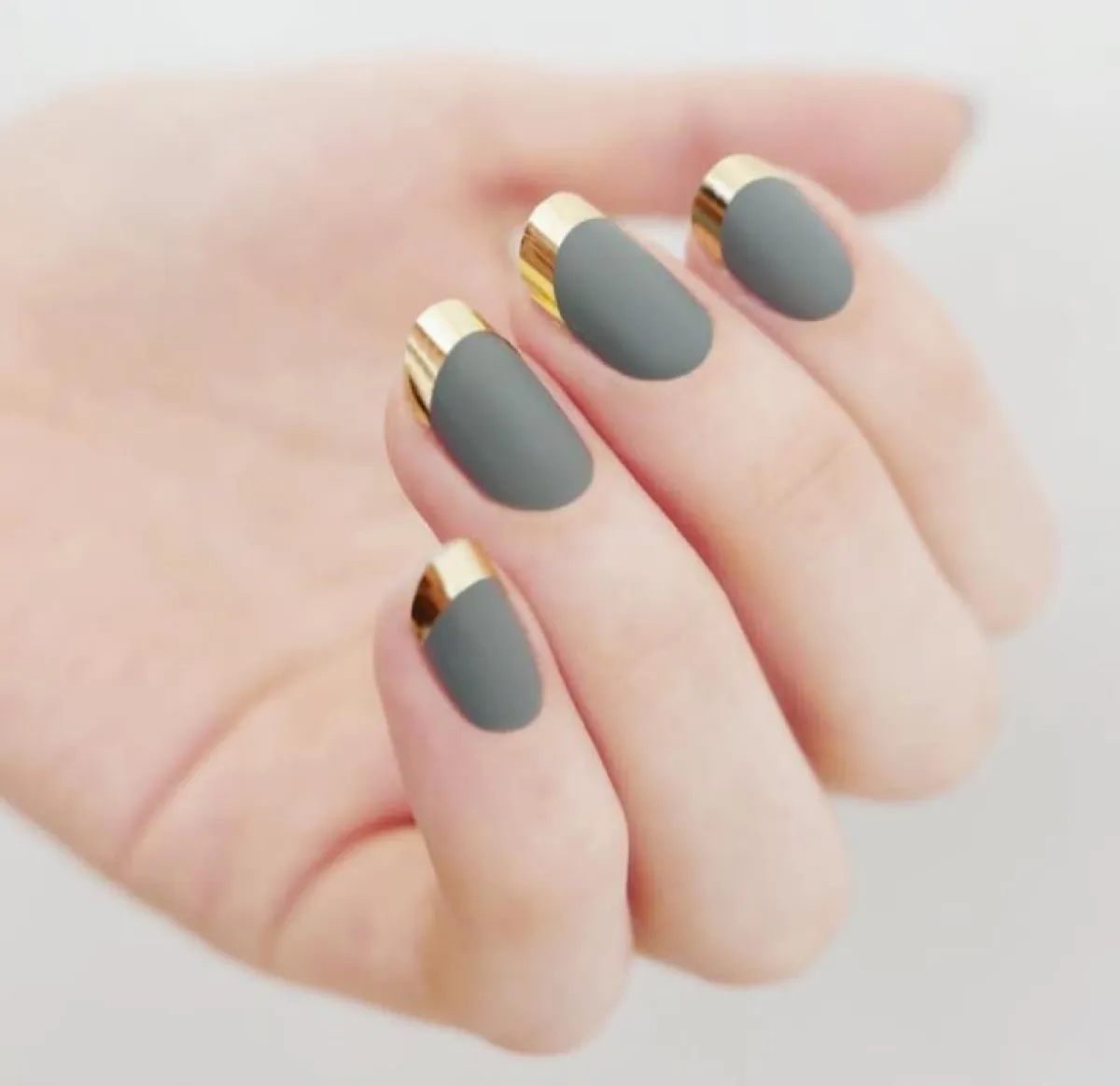 تزيين الأظافر على طريقة الفرنش الفرنسي، بشكل عصري وأنيق في الوقت نفسه، لم يعد يتطلب الكثير من الوقت منك، إذ يكفي أن تضعي طبقة من المناكير الشفاف على أظافرك، وبعد التأكد من جفافها ضعي طبقتين من طلاء الأظافر الرمادي الداكن المات، انتظري قليلاً ومن ثم طبقي قطع الكروم الذهبية عند نهاية الأظافر.