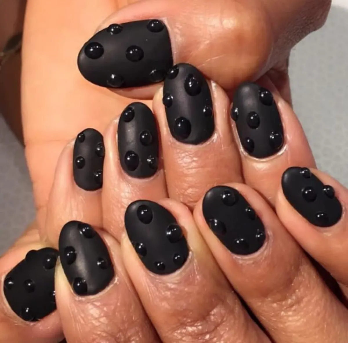 إن كنت تميلين الى موديلات الأظافر الغريبة والمميزة، فلا تترددي في اعتماد أظافر قطرات الماء، بحيث تضعين أولاً طبقتين من المناكير الأسود المات، وحين تجف أظافرك، شكلي قطرات الماء بواسطة المناكير الأسود اللامع.