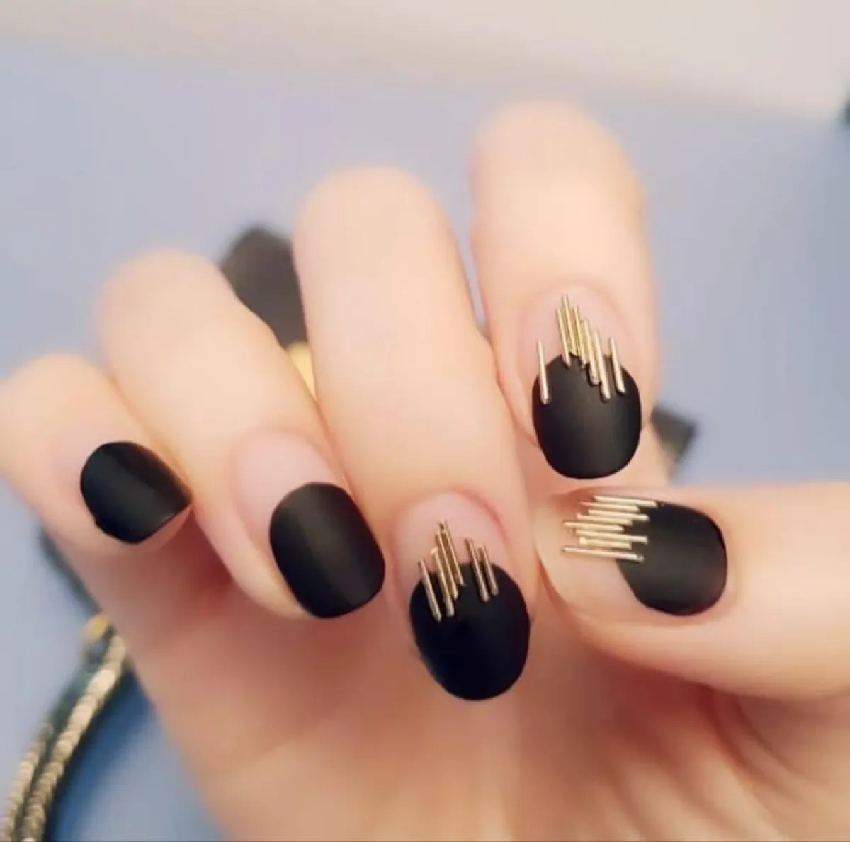 يعد الأسود دائماً اختياراً كلاسيكياً، لكن استخدمي طلاء الأظافر الأسود هذه المرة بطريقة مختلفة وعصرية، وغير متوقعة، بحيث تطلين نصف الظفر بالمناكير الأسود وتتركين النصف الثاني خالياً من المناكير. ومن ثم زيّني وسط الظفر بالمسامير الذهبية الناعمة.