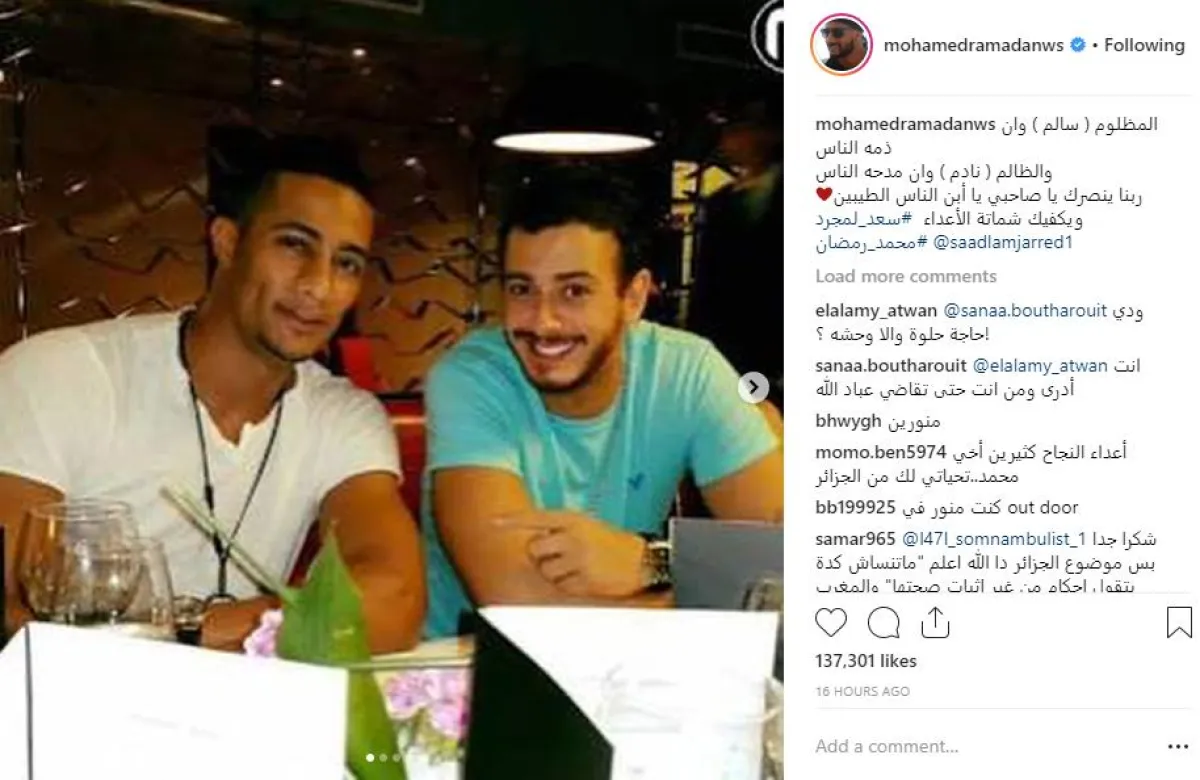 رمضان نشر عبر حساباته بمواقع التواصل الاجتماعي ثلاث صور تكشف عمق صداقته بسعد المجرد، وعلّق عليهم قائلًا: المظلوم سالم وإن ذمّه الناس.. والظالم نادم وإن مدحه الناس.. ربنا ينصرك يا صاحبي يا ابن الناس الطيبين، ويكفيك شماتة الأعداء.