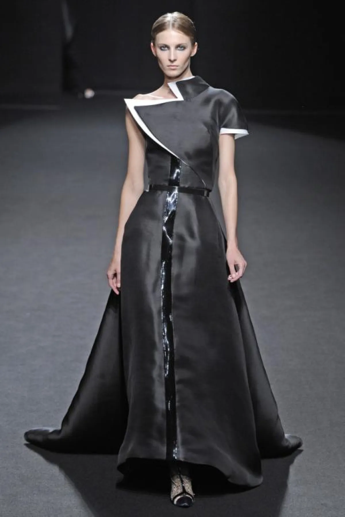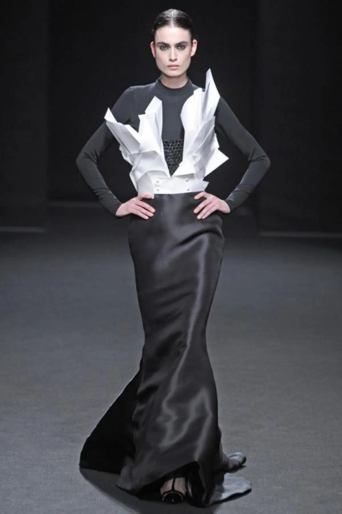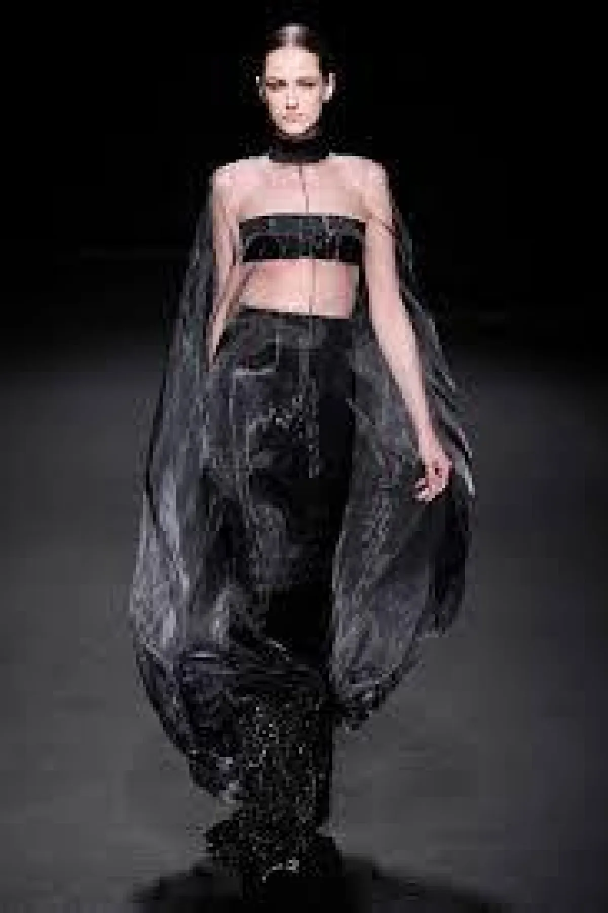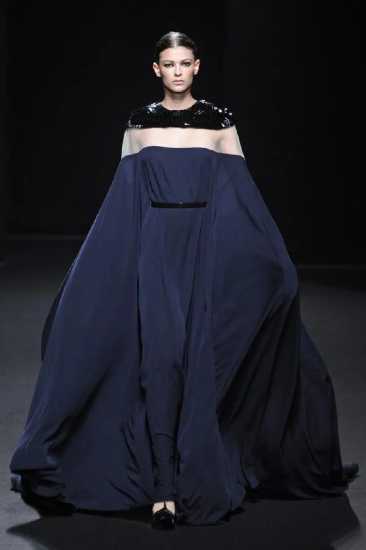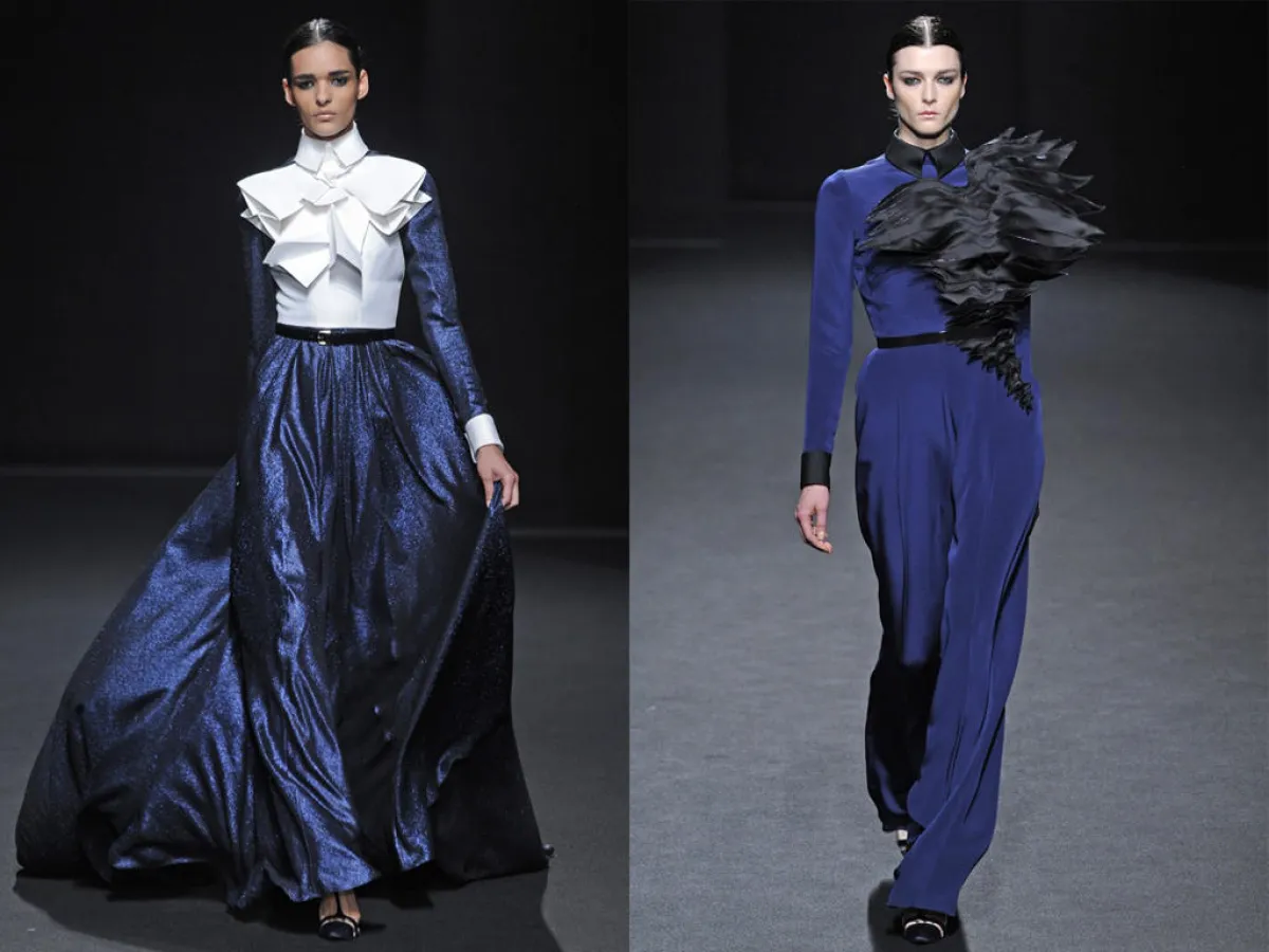 الأزياء التي  قدمها البارحة في إطار أسبوع الموضة الفرنسية للخياطة الراقية، كانت تنبع أنوثة وأناقة من خلال الأقمشة الشفافة و الساتان الأسود الذي طغى على العرض و الذي يبرز جسم المرأة دون أي ابتذال ، ومن خلال التفاصيل الفنية التي طرز بها فساتين السهرة ، التي استوحاها هذه المرة من أعمال الفنان التشكيلي الاسباني فيلاسكاز Vélasquez والتي برزت خاصة على مستوى الياقات البيضاء اللون، وكأنها منحوتات ومثنيات " البلاسترون " الأسود plastrons plissés التي طرز بها الفساتين على مستوى الياقات والخصر وأسفل فساتين السهرة الطويلة.