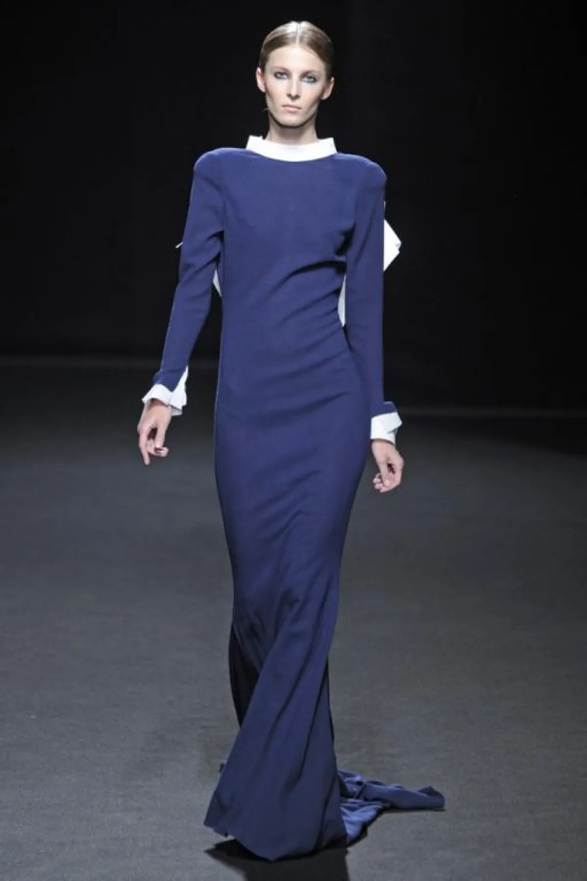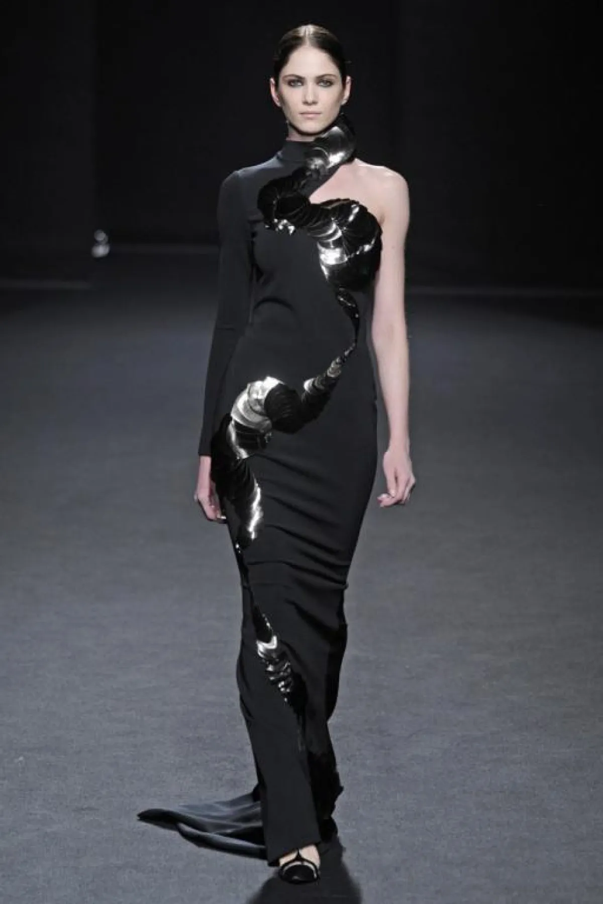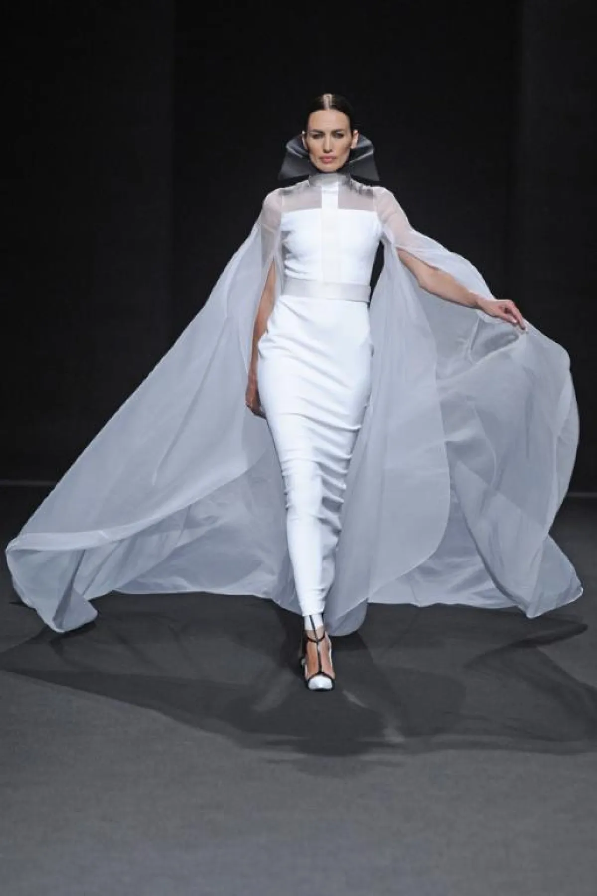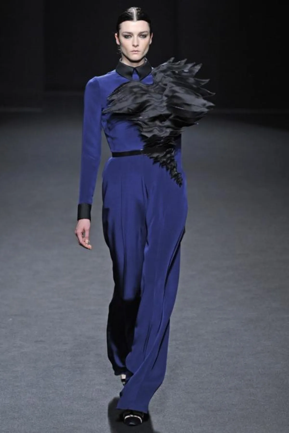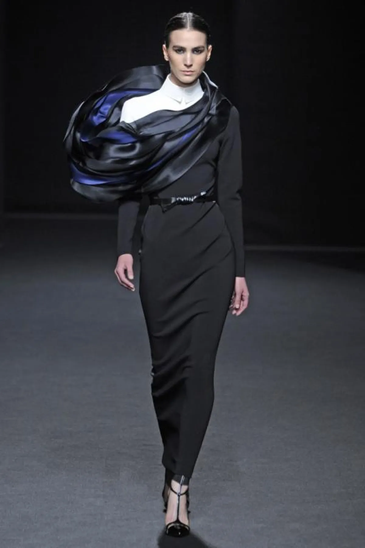 الأزياء التي  قدمها البارحة في إطار أسبوع الموضة الفرنسية للخياطة الراقية، كانت تنبع أنوثة وأناقة من خلال الأقمشة الشفافة و الساتان الأسود الذي طغى على العرض و الذي يبرز جسم المرأة دون أي ابتذال ، ومن خلال التفاصيل الفنية التي طرز بها فساتين السهرة ، التي استوحاها هذه المرة من أعمال الفنان التشكيلي الاسباني فيلاسكاز Vélasquez والتي برزت خاصة على مستوى الياقات البيضاء اللون، وكأنها منحوتات ومثنيات " البلاسترون " الأسود plastrons plissés التي طرز بها الفساتين على مستوى الياقات والخصر وأسفل فساتين السهرة الطويلة.