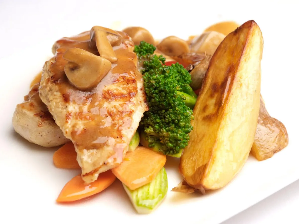 4- تسوّى "الفراخ سوتيه" وعليها الماشروم والكريما صوص، وبجانبها الخضر المطهوّة بالزبدة والبطاطس المسلوقة.