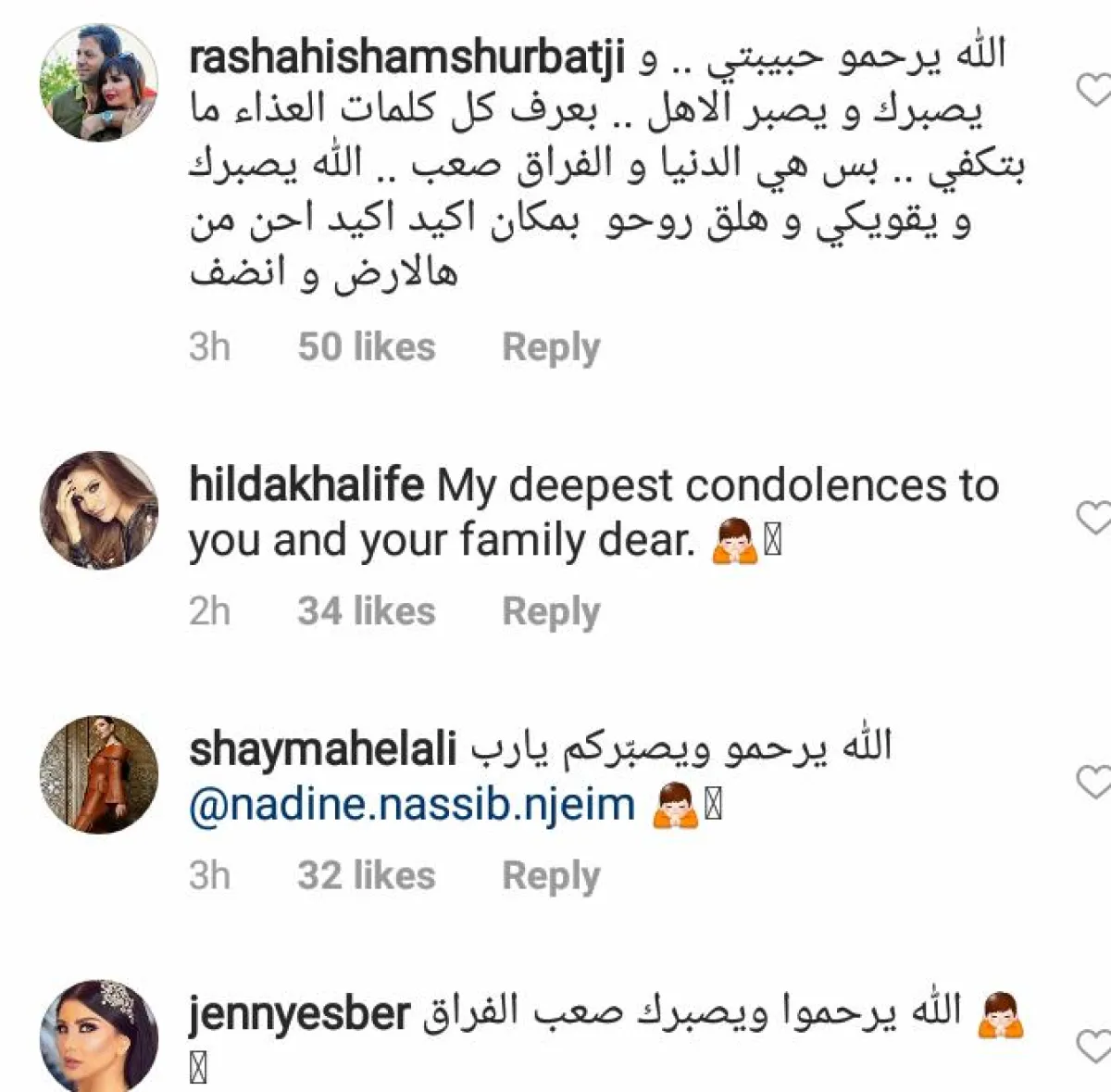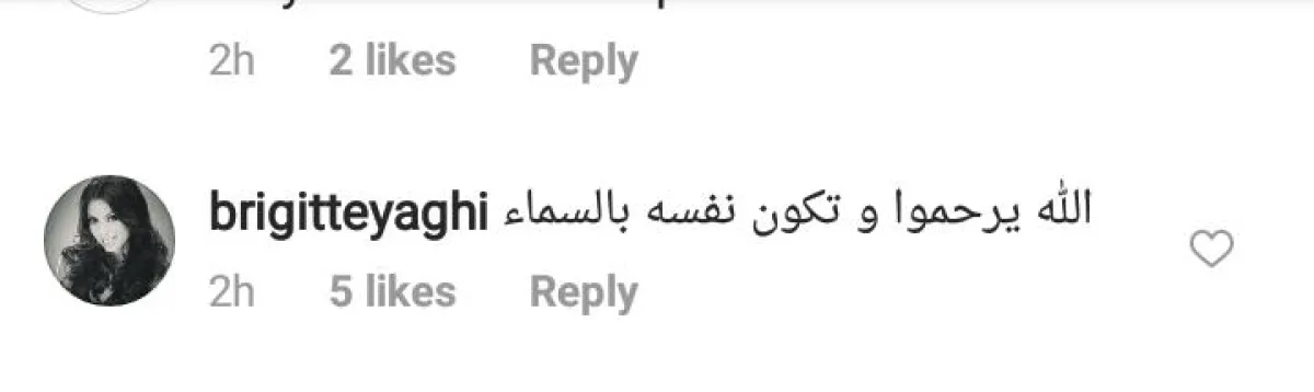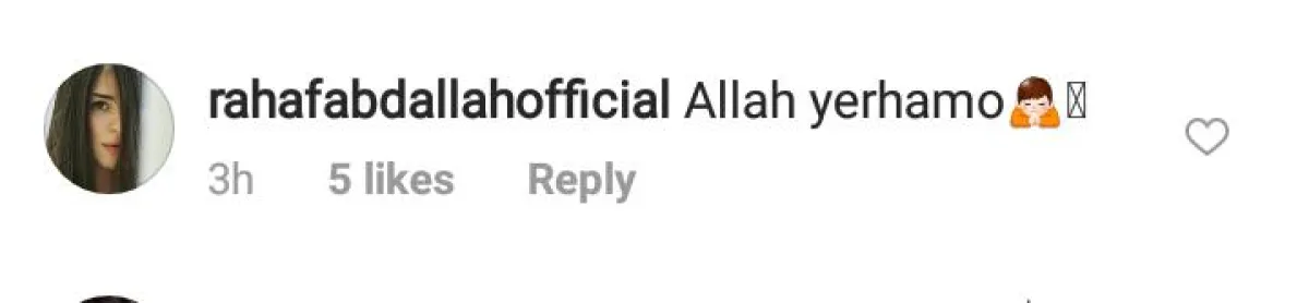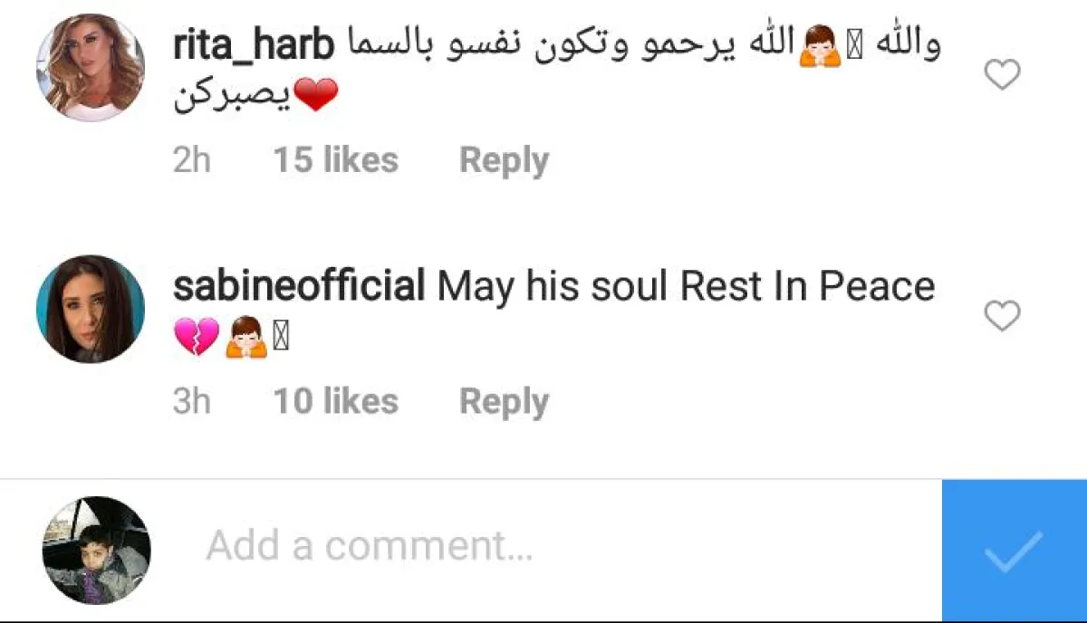 رشا شربتجي: "الله يرحمه حبيبتي ويصبرك ويصبر الاهل. بعرف كل كلمات العزاء ما بنكفي بس هي الدنيا والفراق صعب. الله يصبرك ويقويك وهلق روحه بمكان أكيد أخن من هالأرض وأنظف".