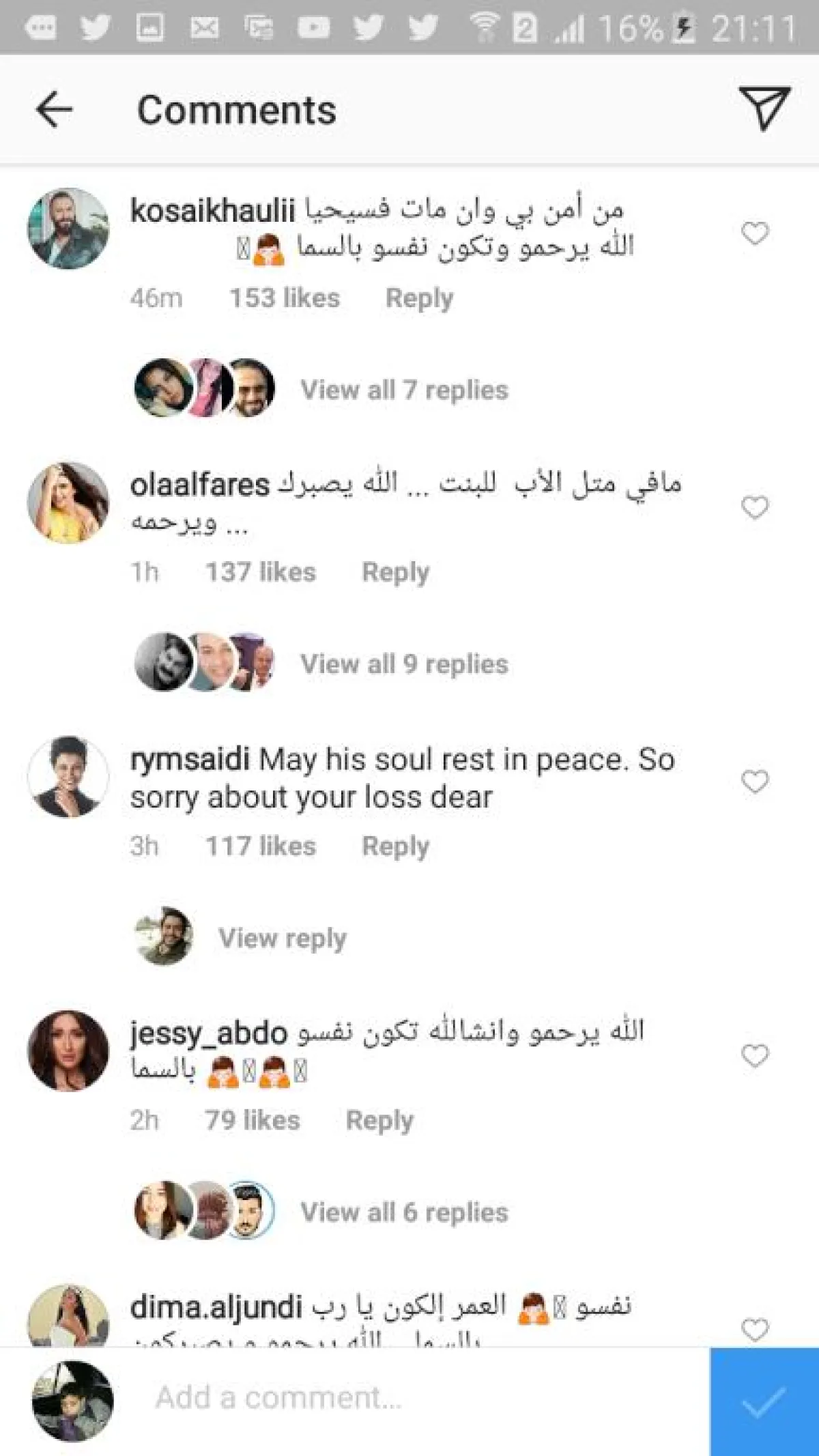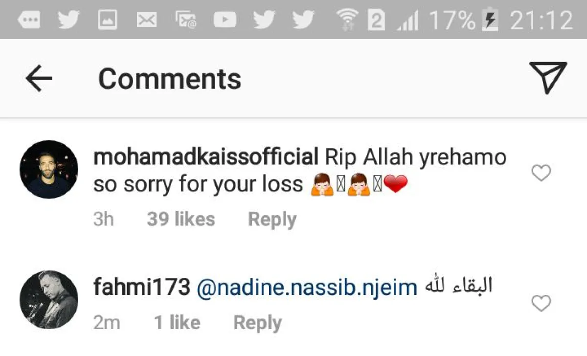 وسارع الفنانون إلى تقديم التعازي الى نادين نجيم، من بينهم المنتج صادق الصباح الذي كتب: "رحم الله الفقيد الغالي وأسكنه فسيح جنّاته، ولنادين نجمتنا الغالية وعائلتها الكريمة الصبر والسلوان. إنّا لله وإنّا إليه راجعون".