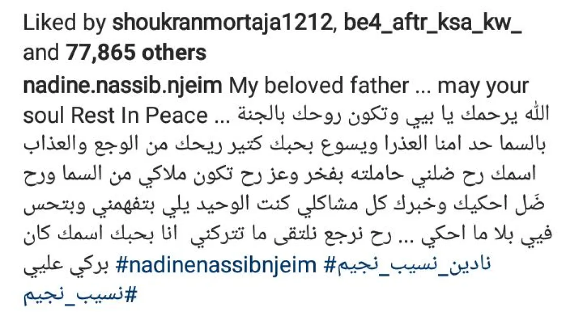 ونعت نادين نجيم والدها بكلمت مؤثرة، أظهرت تعلقها الكبير به كأب وصديق وكتبت "My beloved father ... may your soul Rest In Peace ... الله يرحمك يا بيي وتكون روحك بالجنة بالسما حد امنا العذرا ويسوع بحبك كتير، ريحك من الوجعع والعذاب. اسمك رح ضلني حاملته بفخر وعز رح تكون ملاكي من السما ورح ضَلل احكيك وخبرك كل مشاكلي. كنت الوحيد يلي بتفهمني وبتحس فيي بلا ما احكي ... رح نرجع نلتقى. ما تتركني. انا بحبك. اسمك كان بركي عليي".