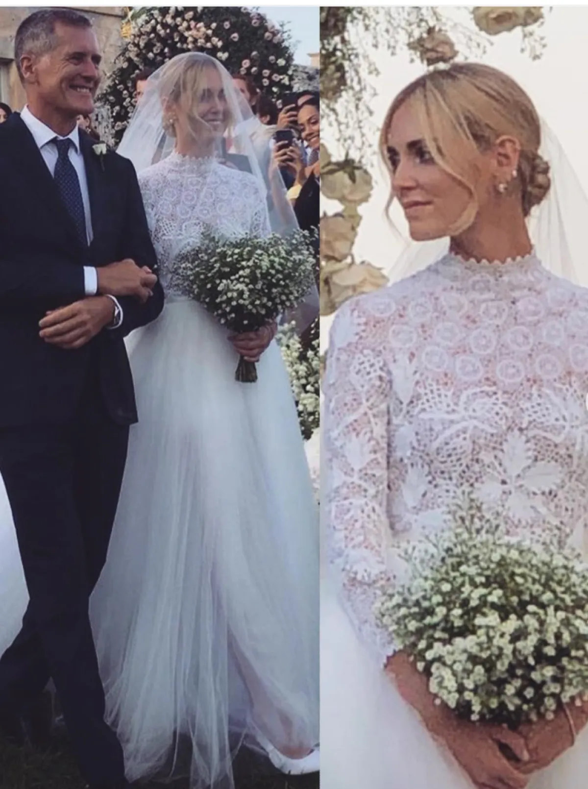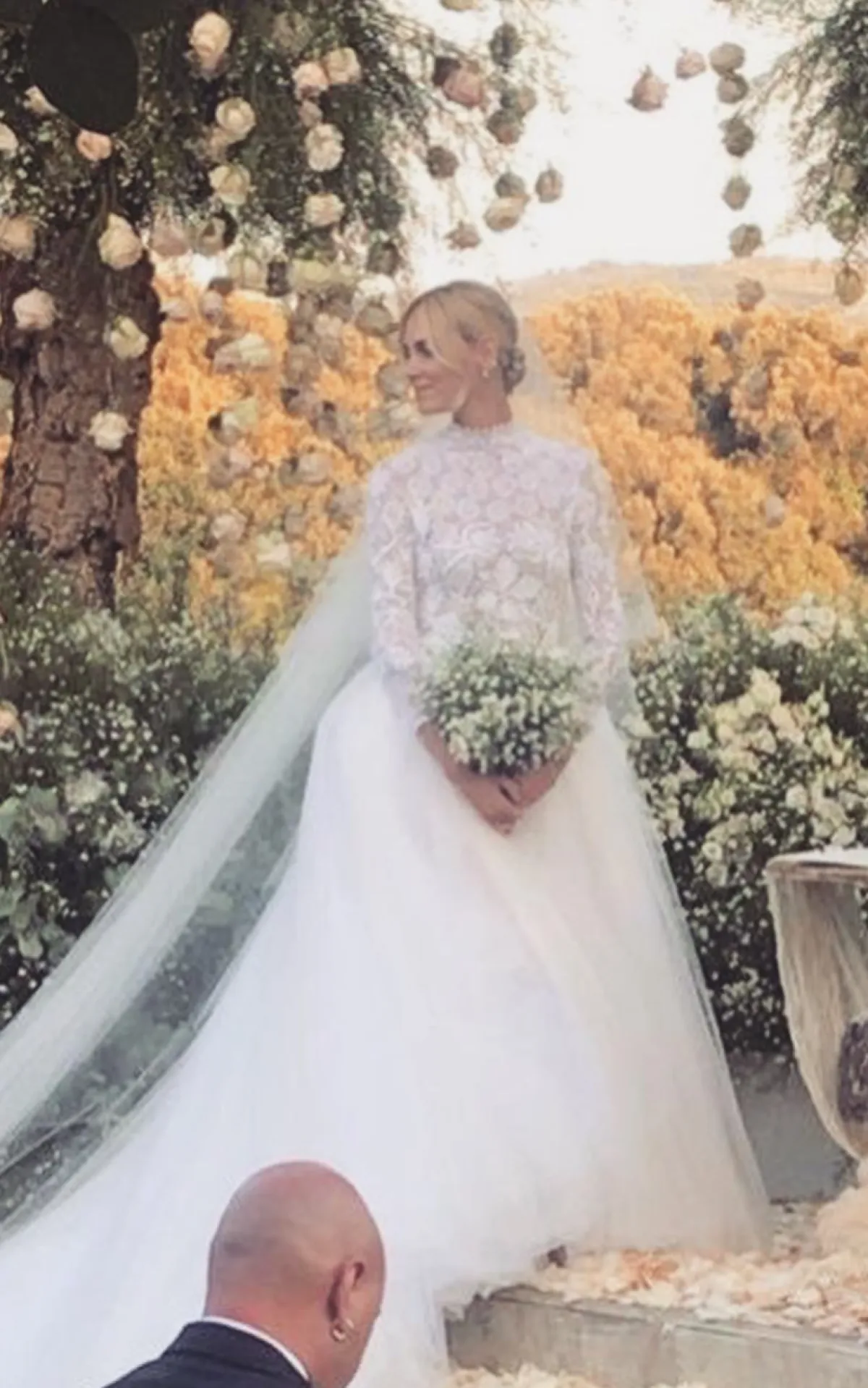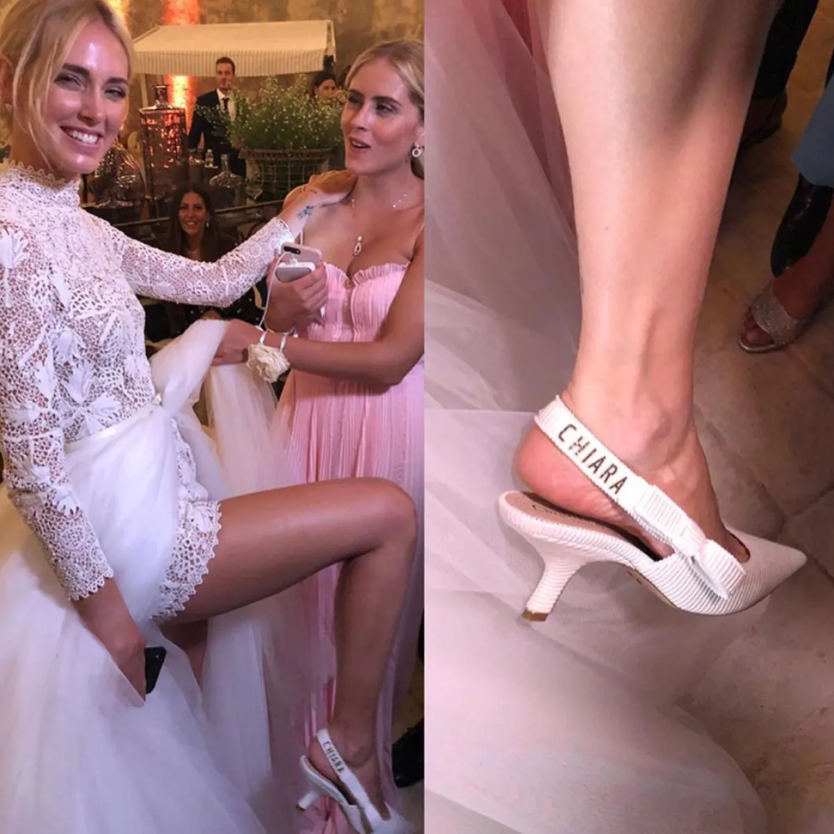 واختارت كيارا لإطلالتها فستان زفاف من ماركة Dior صمّم خصيصاً لها مع حذاء صمم خصيصاً لها ونقش عليه اسمها باللون الذهبي.