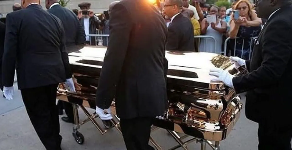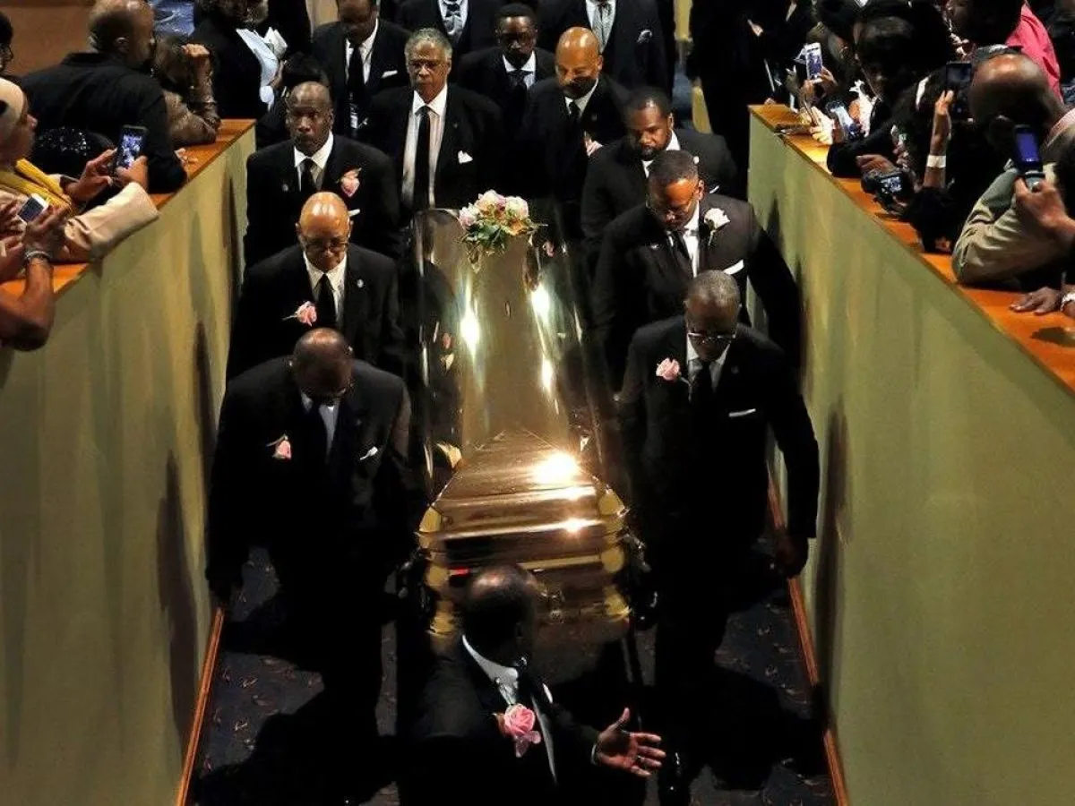 وألبست الراحلة أريثا فرانلكين، استعداداً للجنازة، فستان من الذهب الرائع وكعوب حذاء لامعة.