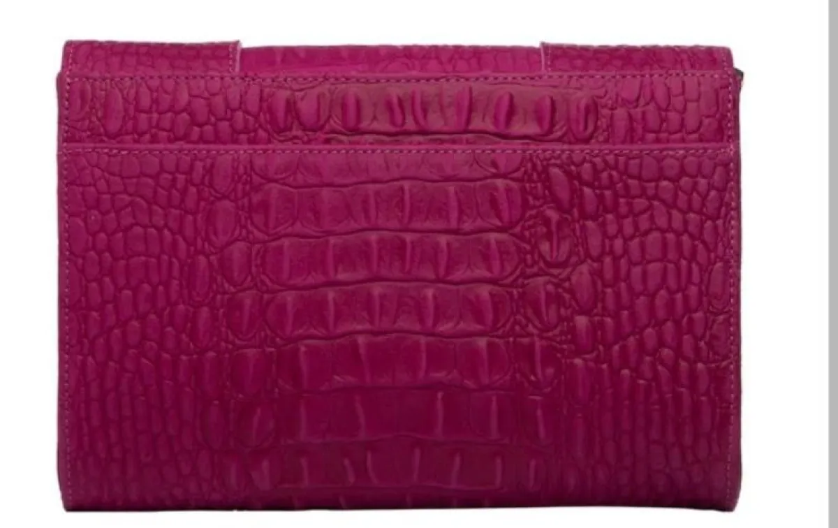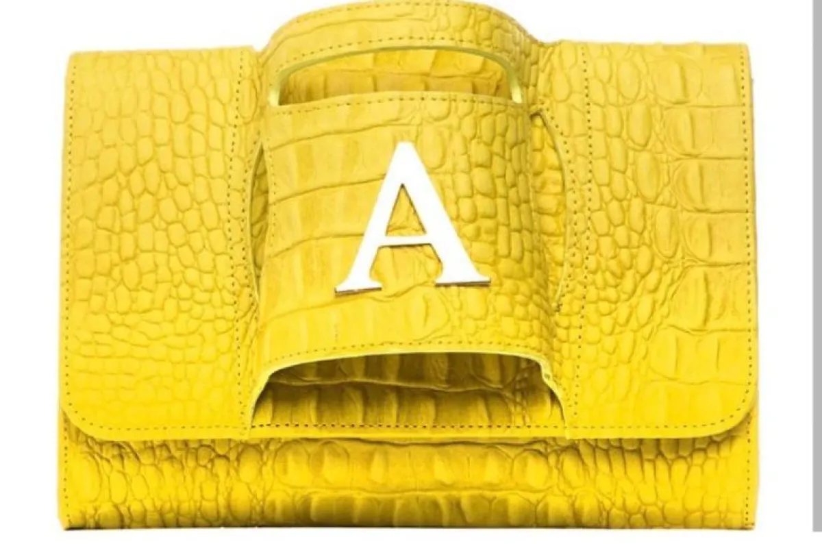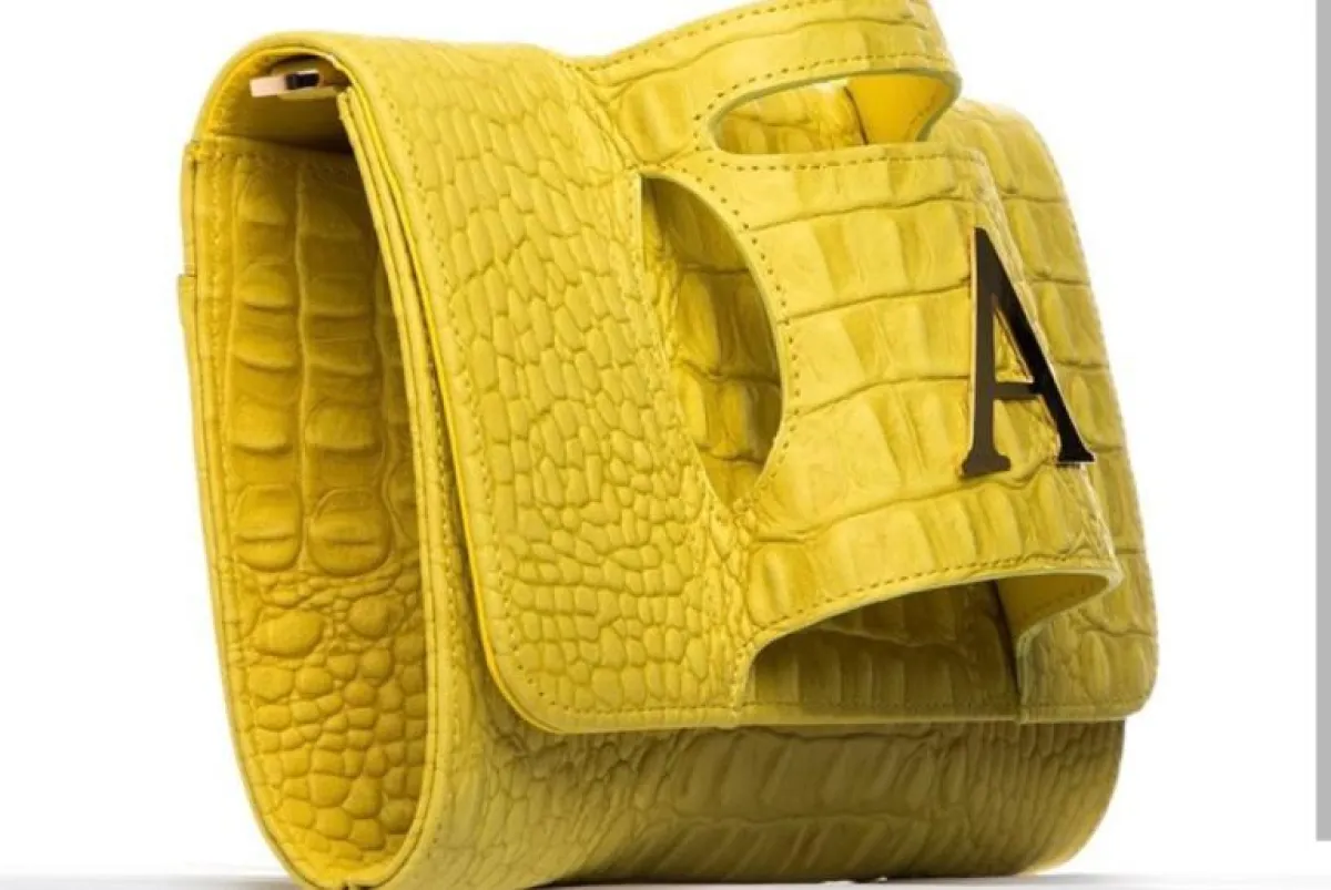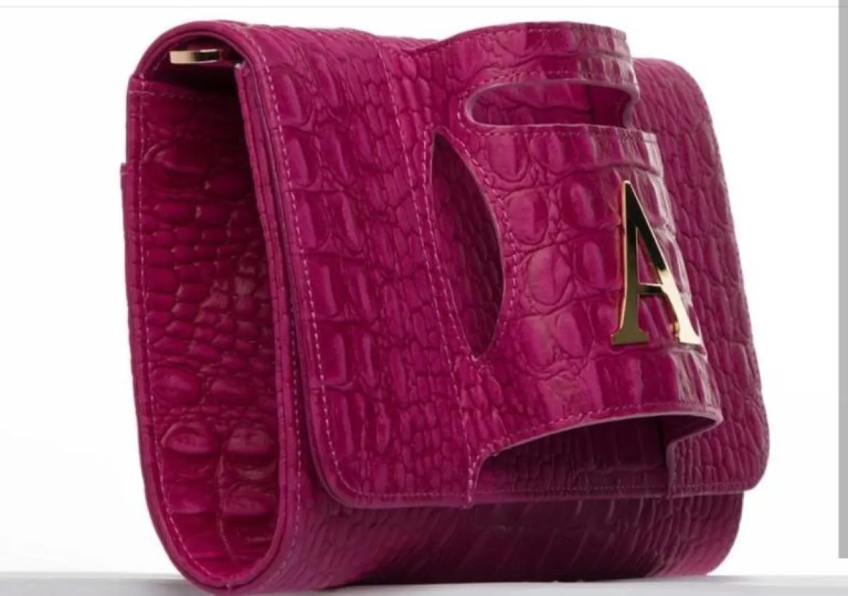 أما تصميم الشنطة، حمل ألوان الأصفر والبنفسجي على شكل نقشة جلد التمساح وحرف اسم أحلام في الوسط.
