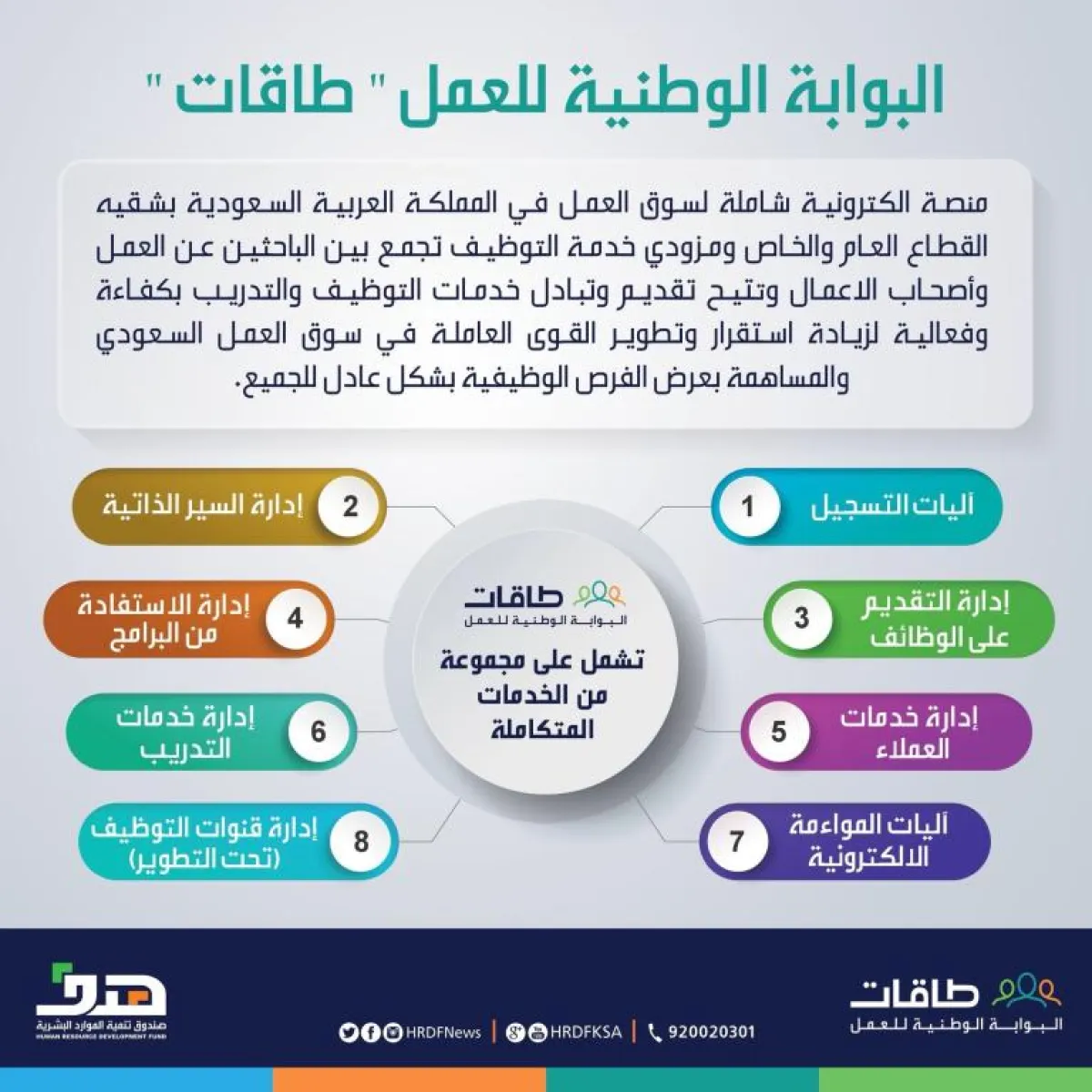 وتوفر البوابة الوطنية للعمل "طاقات" عديدًا من الخيارات أمام طالبي العمل من جهة وأصحاب العمل من جهة أخرى، وذلك في إطار الحرص على توفير فرص توظيف مجدية لأبناء وبنات الوطن من الباحثين والباحثات عن عمل، وخدمة أصحاب العمل ومنشآت القطاع الخاص في توفير موارد بشرية وطنية منتجة.