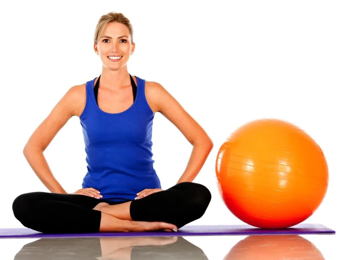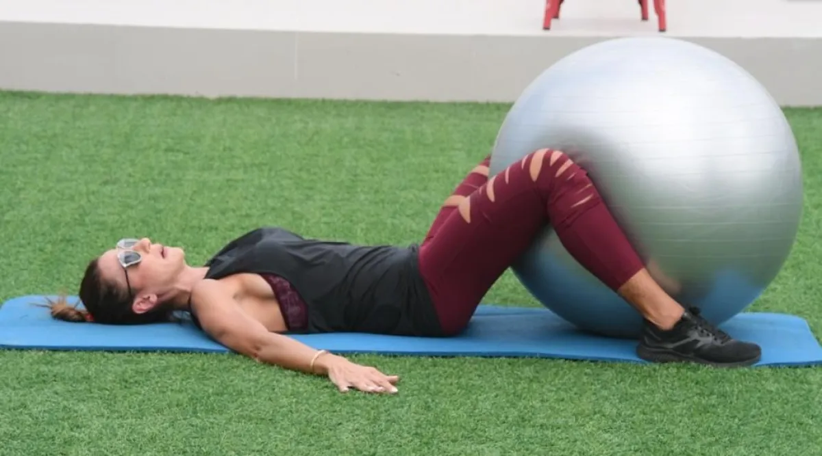 3. استلقي على الظهر وضعي الكرة السويسرية بين ركبتيك، مع شدّ الأخيرتين عليها مما يساعد في نحت الساقين.