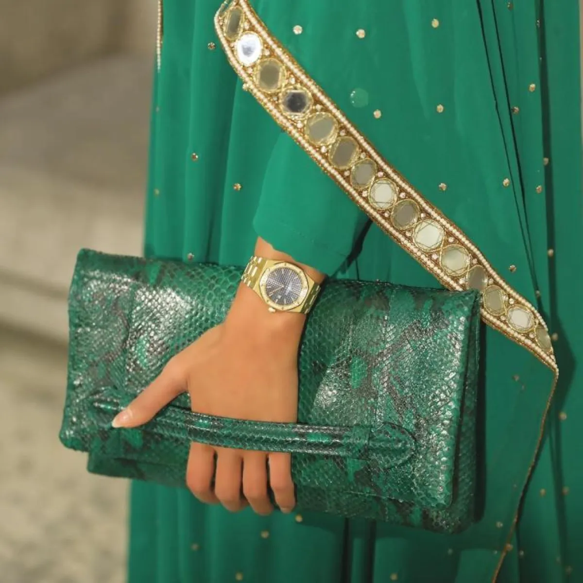 اختارت المدونة المحجبة مرمر حقيبة من جلد التمساح باللون الأخضر مع عباءة من نفس اللون، وجاء هذا الأخضر غاية في الأناقة ربما لأنه قريب من لون بعض أنواع التمساح الحقيقي، أما الإعلامية نهى نبيل فنسقت حقيبة فضية صغيرة الحجم من جلد التمساح مع جيمبسوت كاجوال، كما تألقت بحقيبة أخرى من نفس الطراز ولكن بمزيج الأزرق والأسود، واللافت أنها نسقتها مع حذاء رياضي لإطلالة كاجوال، وأخيراً نذهب للمصممة السعودية العنود بدر التي نصحت متابعيها باقتناء حقيبة مزينة من جلد التمساح، واختارت اللون الأحمر الداكن مع إطلالة سوداء بالكامل.