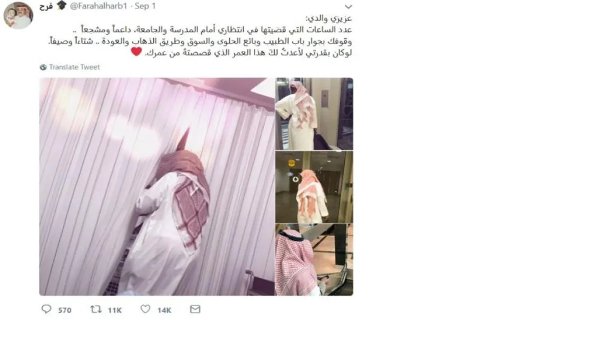 حققت تغريدة مؤثرة لطالبة سعودية تتحدث فيها عن دور والدها في حياتها، تفاعلًا كبيرًا بين المُغردين، حيث عبّرت الطالبة عن وفائها لوالدها الذي كان يدعمها منذ دخولها المدرسة وحتى التحاقها بالجامعة.