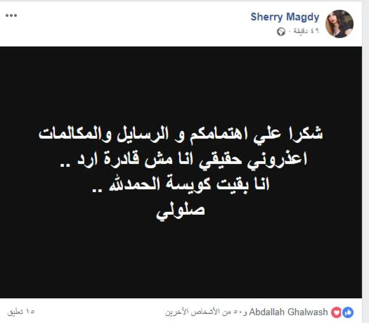 شيري حذفت الرسالة بعد تزايد قلق معارفها، ونشرت بدلاً منها رسالة أخرى اعتذرت فيها من الجميع لعدم الرد على الهاتف وقالت: "شكرا علي اهتمامكم و الرسايل والمكالمات اعذروني حقيقي انا مش قادرة ارد .. انا بقيت كويسة الحمدلله .. صلولي."