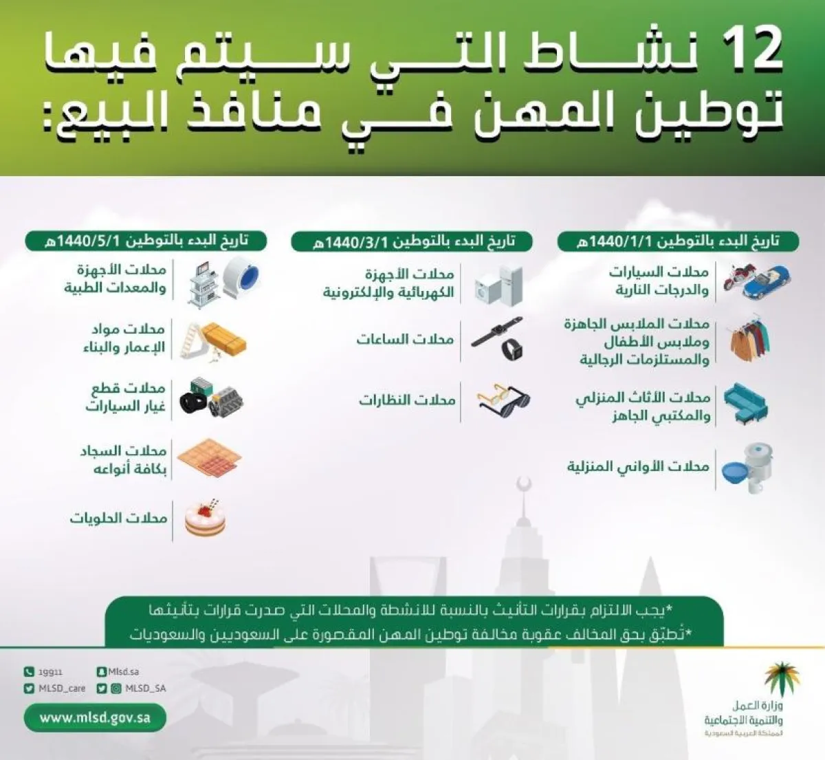 قالت وزارة العمل والتنمية الاجتماعية، إن بدء توطين المهن بمنافذ البيع في أنشطة محلات السيارات والدراجات النارية، ومحلات الملابس الجاهزة وملابس الأطفال والمستلزمات الرجالية، ومحلات الأثاث المنزلي والمكتبي الجاهز، ومحلات الأواني المنزلية، بعد 6 أيام في تاريخ 01/01/1440هـ، (الموافق 11 سبتمبر 2018م)، وذلك سعيا من وزارة العمل والتنمية الاجتماعية لتمكين المواطنين والمواطنات من فرص العمل ورفع معدلات مشاركتهم في القطاع الخاص.