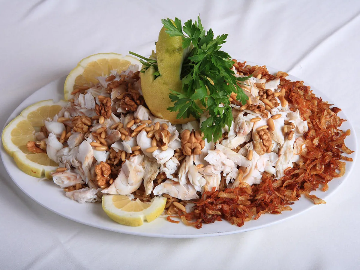 7 ـ يُسكب الأرز في طبق، ويُوزّع السمك فوقه والصلصة إلى جانبه.