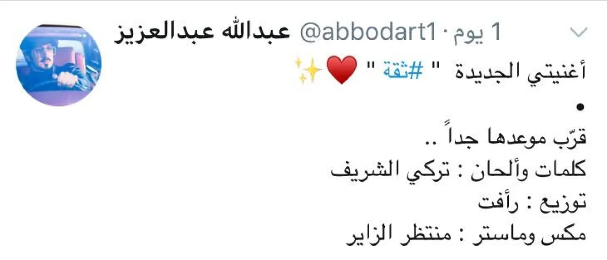 يستعد الفنان عبد الله عبد العزيز لطرح عمل غنائي منفرد بعنوان: "ثقة"، من كلمات وألحان تركي الشريف، وقد غرَّد عبد الله عبر حسابه الرسمي على موقع التواصل "تويتر"، معلنًا عن استعداده لطرح الأغنية، ومنوّهًا بأنّ موعدها أصبح قريبًا، مشوّقًا بذلك محبّيه ومتابعي صفحته الرسمية.