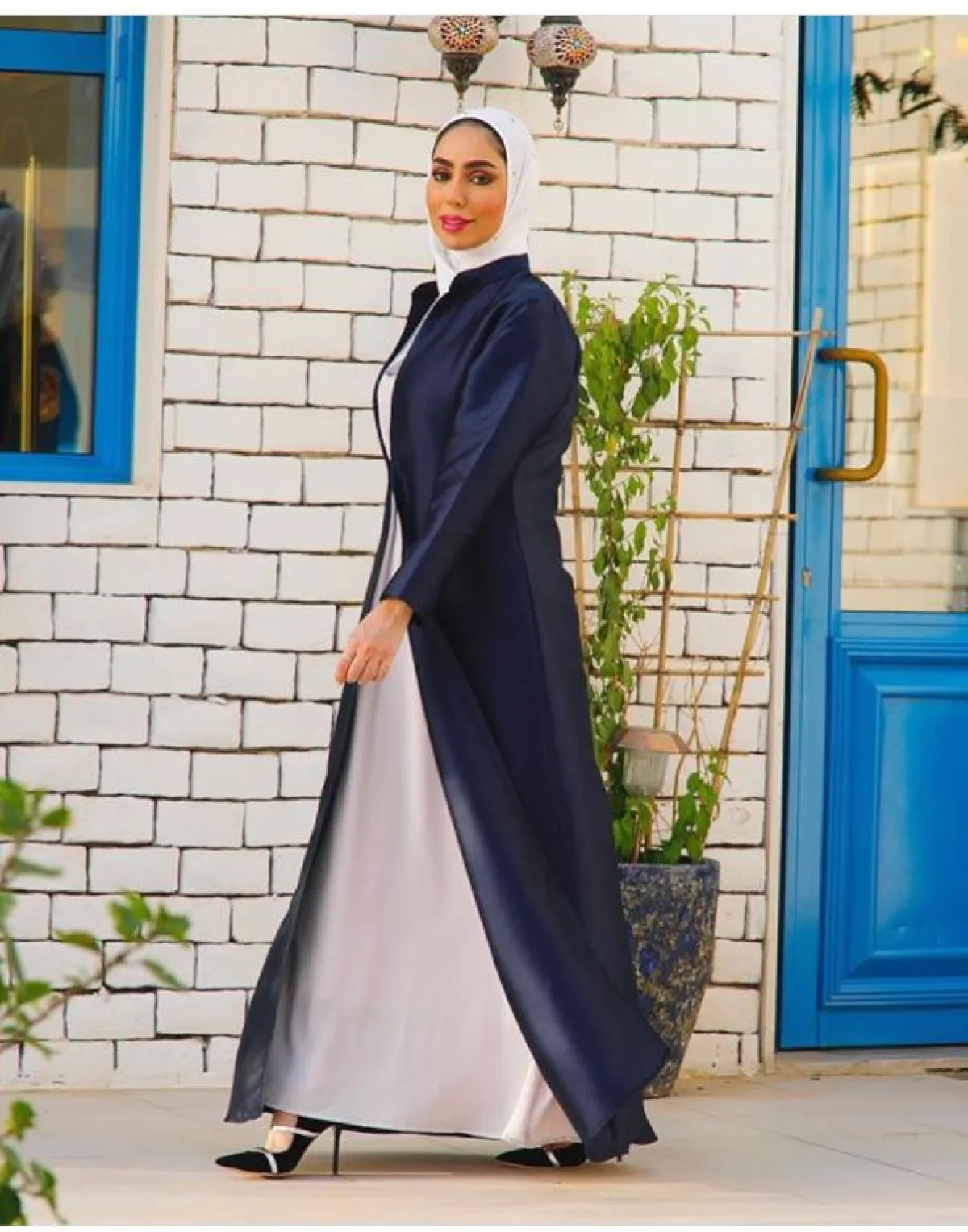 في المقابل اعتمدت المدونة فاطيما على العباية بالستان اللامع باللون الكحلي الأزرق، ونسقت معها فستانا أبيض لتترك العباية مفتوحة، وحجاب من نفس اللون، لكنها اختارت الحذاء باللون الأسود، مع أربطة بيضاء. ويعتبر هذا التصميم مثاليا للمرأة الثلاثينة، ولكن لا ننصح به الشابات الصغار.