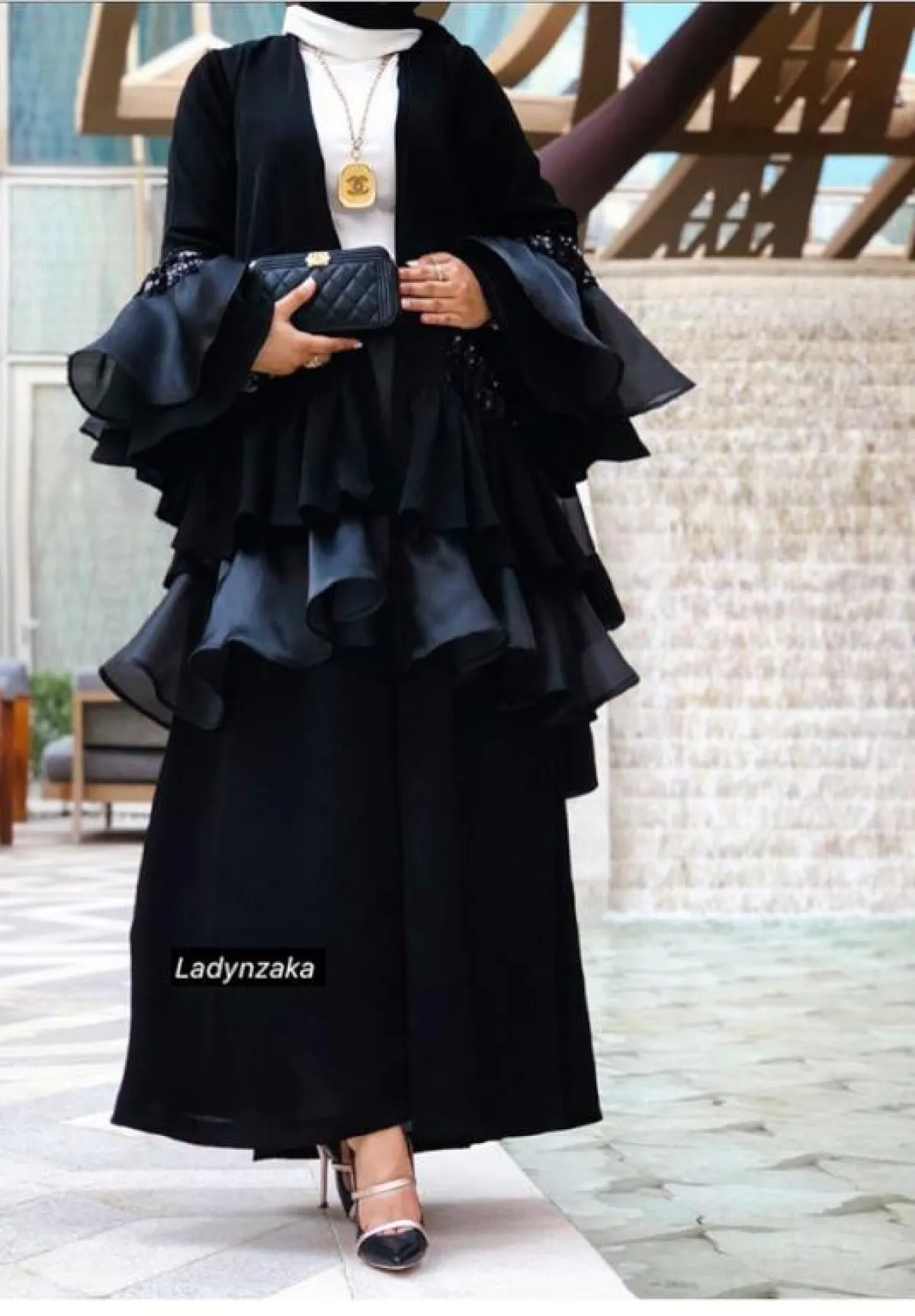 من يقول أن اللون الداكن في العبايات لا يتيح لك لفت الأنظار فهو مخطئ، يمكننا النظر إلى تصميم Lady Nazaka عبايات نازاكا بالعباية مع الكشاكش المنفوشة بخامة الشيفون، على منطقة الأرداف، والأكمام، تناسب المراة الثلاثينية والأربعينية، وتناسب السهرات الكلاسيكية.