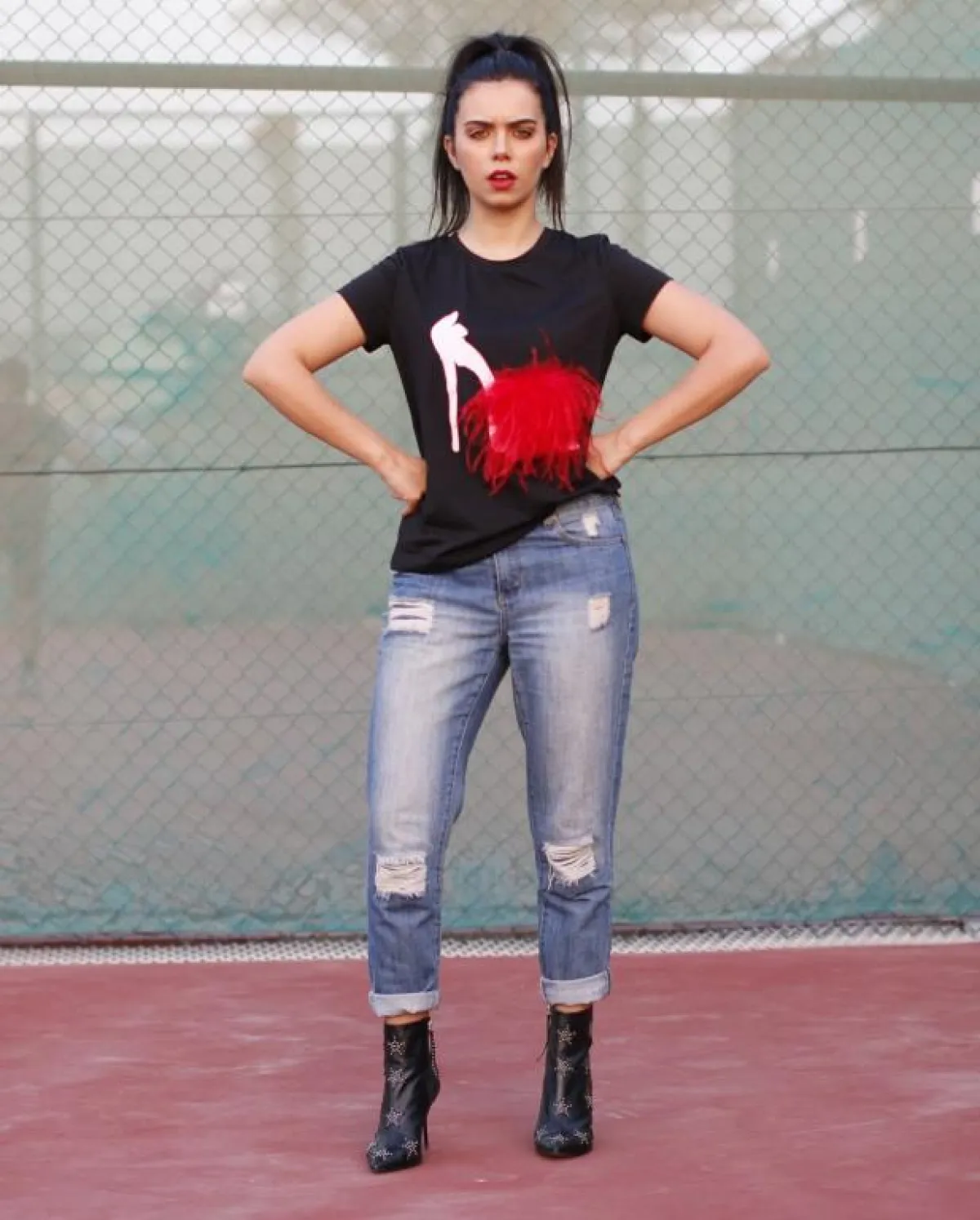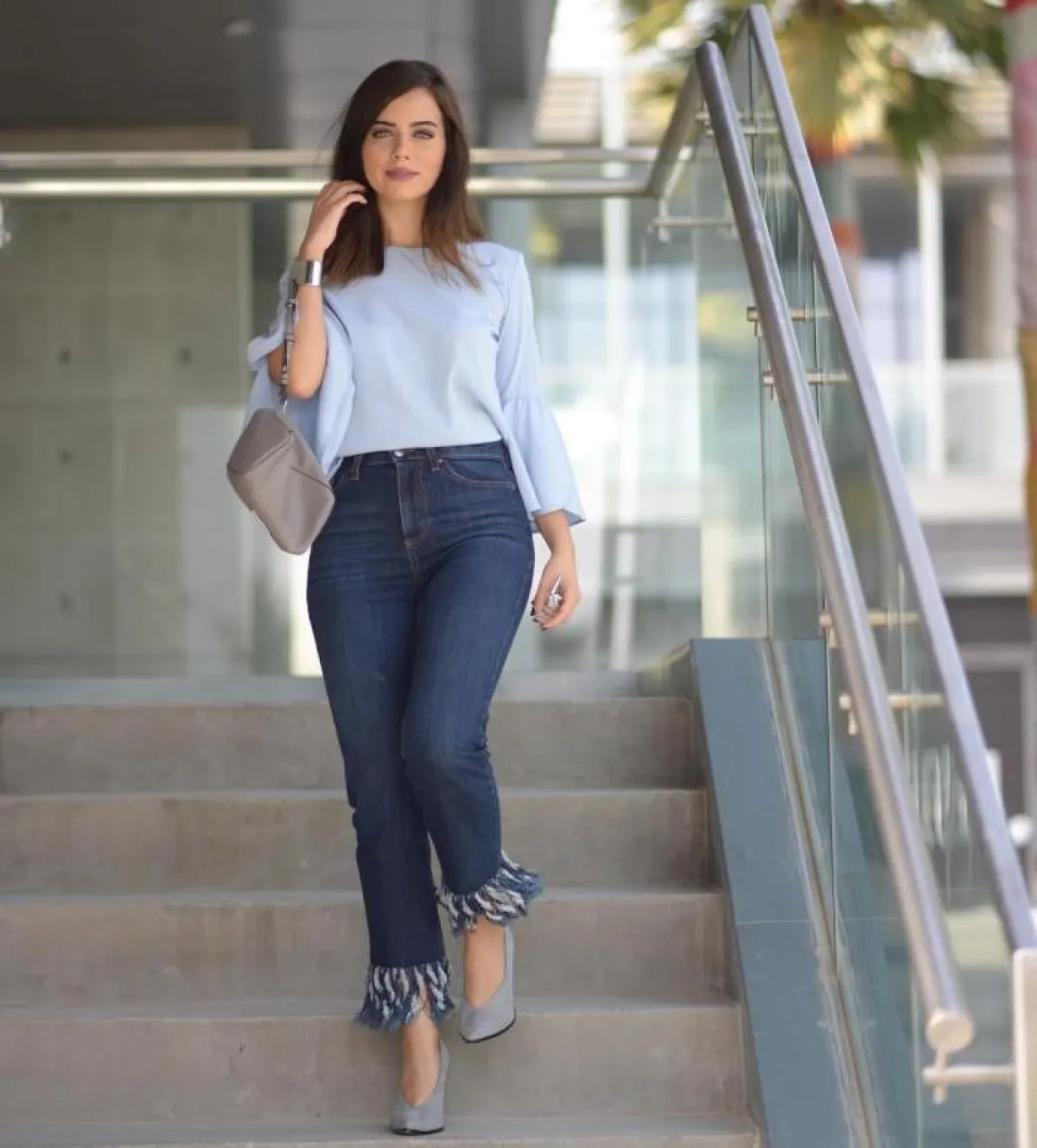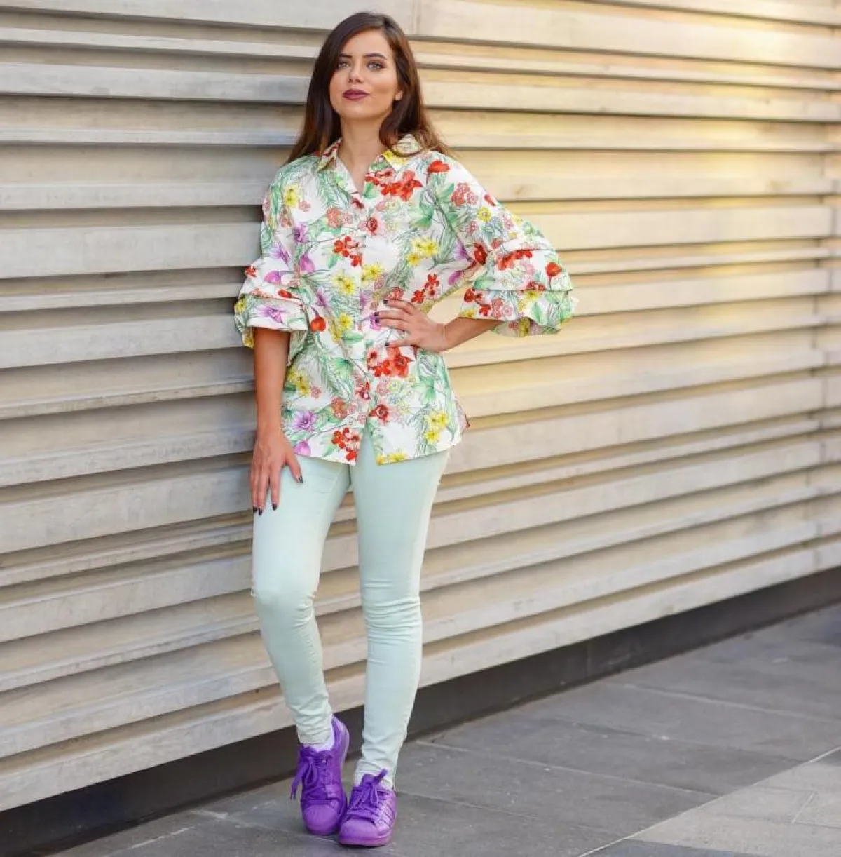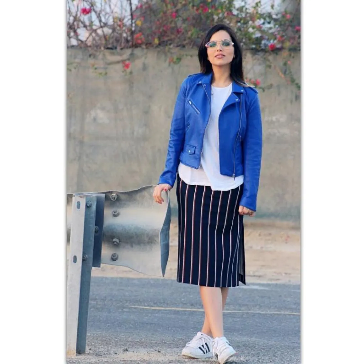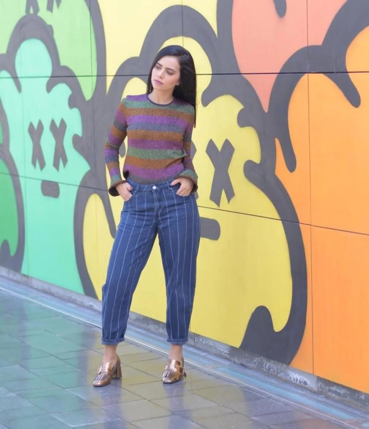 من الصيحات الغريبة التي ظهرت هذا العام هو مزج الخطوط العرضية والطولية معاً في نفس الإطلالة، وهو مزيج اختارته عزة زعرور من خلال بنطلون أزرق مع قطعة فوقية بدرجات اللافندر والجملي معاً، ونسقته مع حذاء ميتالك.