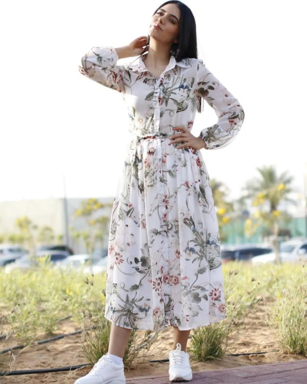 احتلت الفساتين أهمية بالغة وسط صيحات موضة 2018، وخاصة الفساتين الطويلة والمزينة بالزهور، ولا مانع من أن تختار الفتاة الجامعية نفس الصيحة وتنسقها على طريقة عزة زعرور التي بدت كفتاة صغيرة حالمة. كما ذهبت إلى التنورة متوسطة الطول مع بوت بعنق قصير وقطعة فوقية فضفاضة.