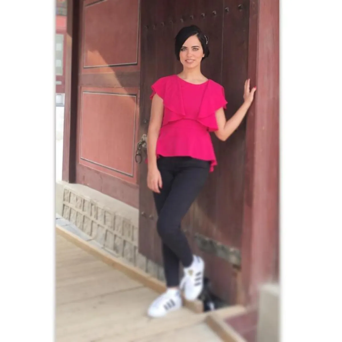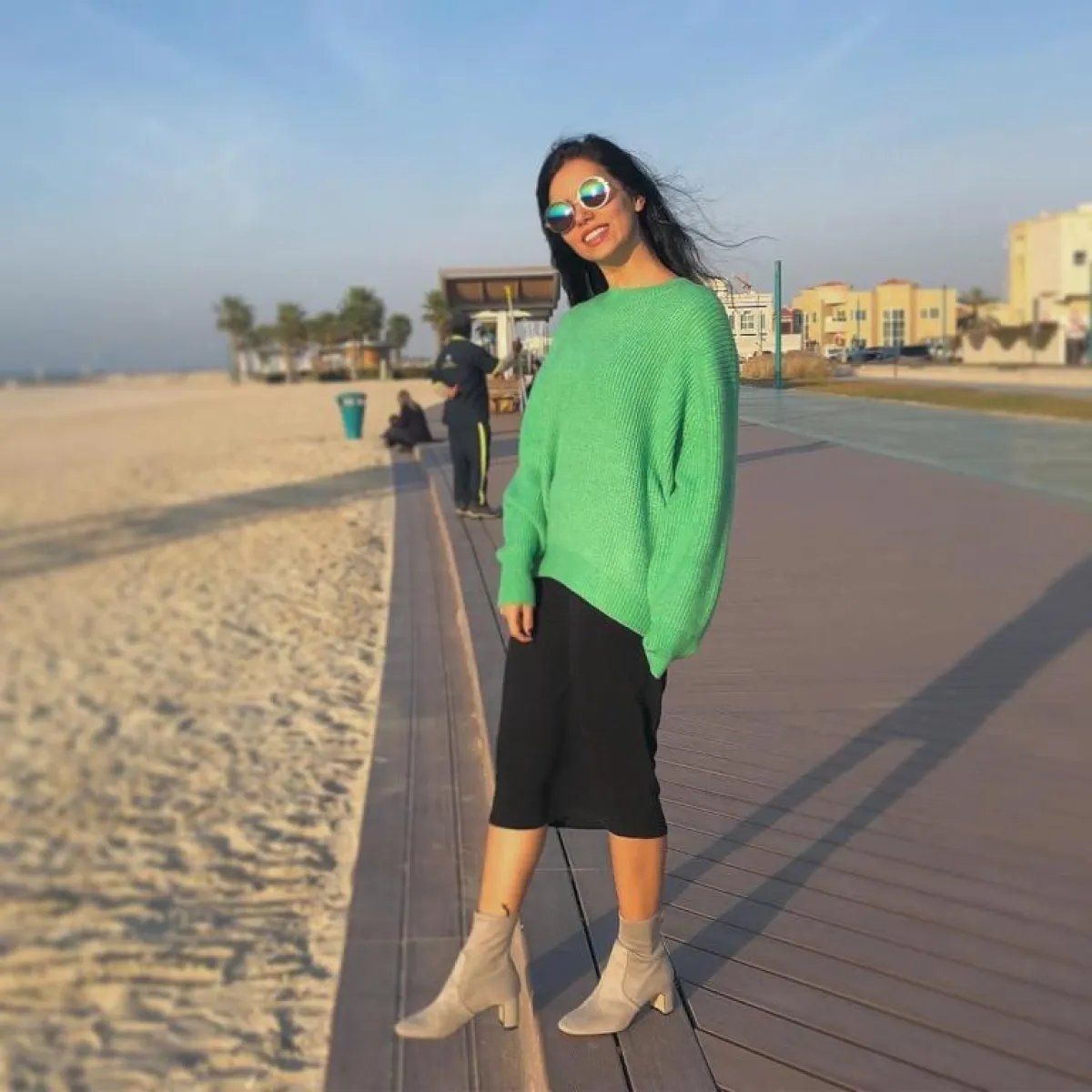 كما اختارت عزة إطلالة أخرى من موضة الخريف ولكن هذه المرة بمربعات الكاروهات التي نسقتها من خلال جاكيت البليزر مع بنطلون كلاسيكي وحذاء رياضي.