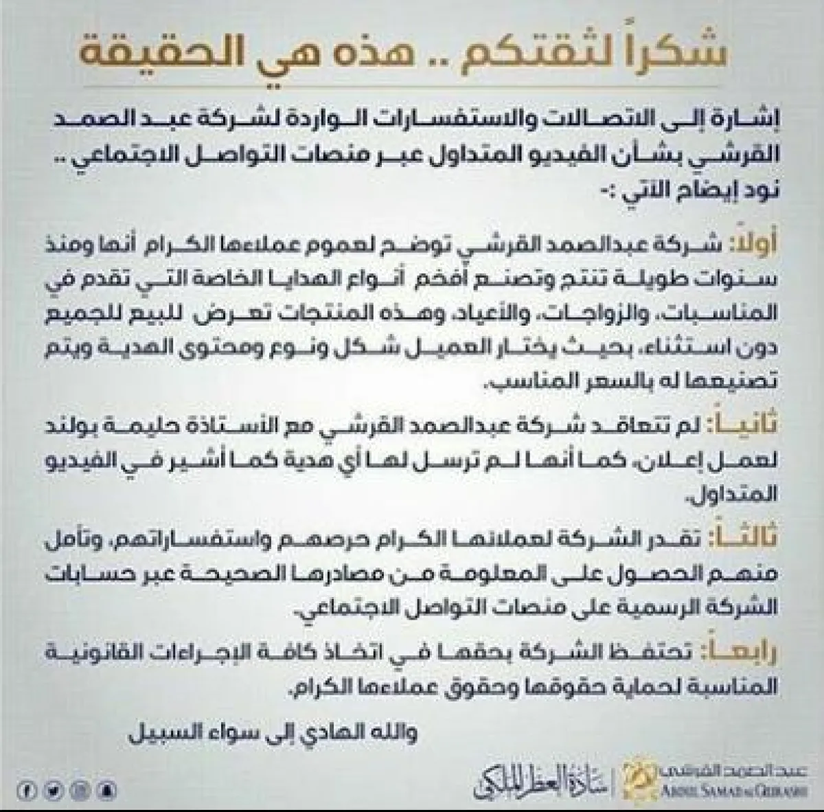 شركة عبد الصمد القرشي ما لبثت أن أصدرت بياناً توضيحياً قالت فيه مجدداً إنها لم تقدم أي هدية لحليمة بولند كما أشارت الأخيرة ، موضحة أنها لم تتعاقد معها بخصوص أي إعلان لمصلحتها، كما هددت باللجوء الى القضاء لحماية حقوقها وحقوق عملائها.