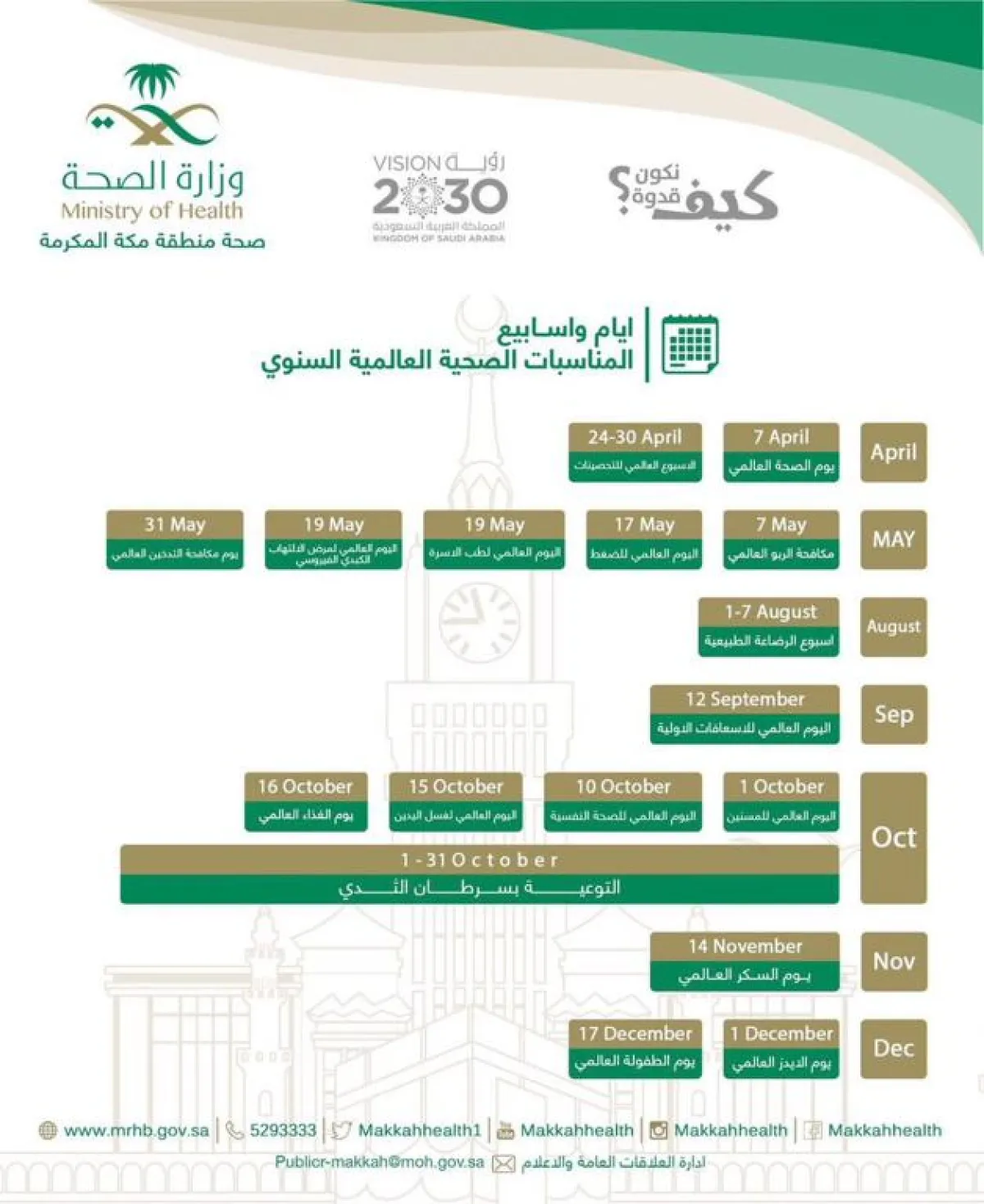 أكدت الشؤون الصحية المدرسية بتعليم منطقة مكة المكرمة على ضرورة تنفيذ وتفعيل الأيام والأسابيع الصحية العالمية بكافة المدارس خلال العام الدراسي الجاري .