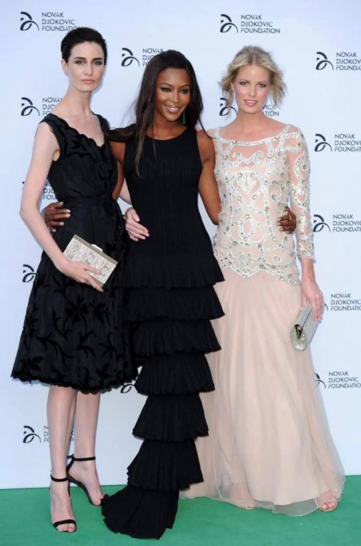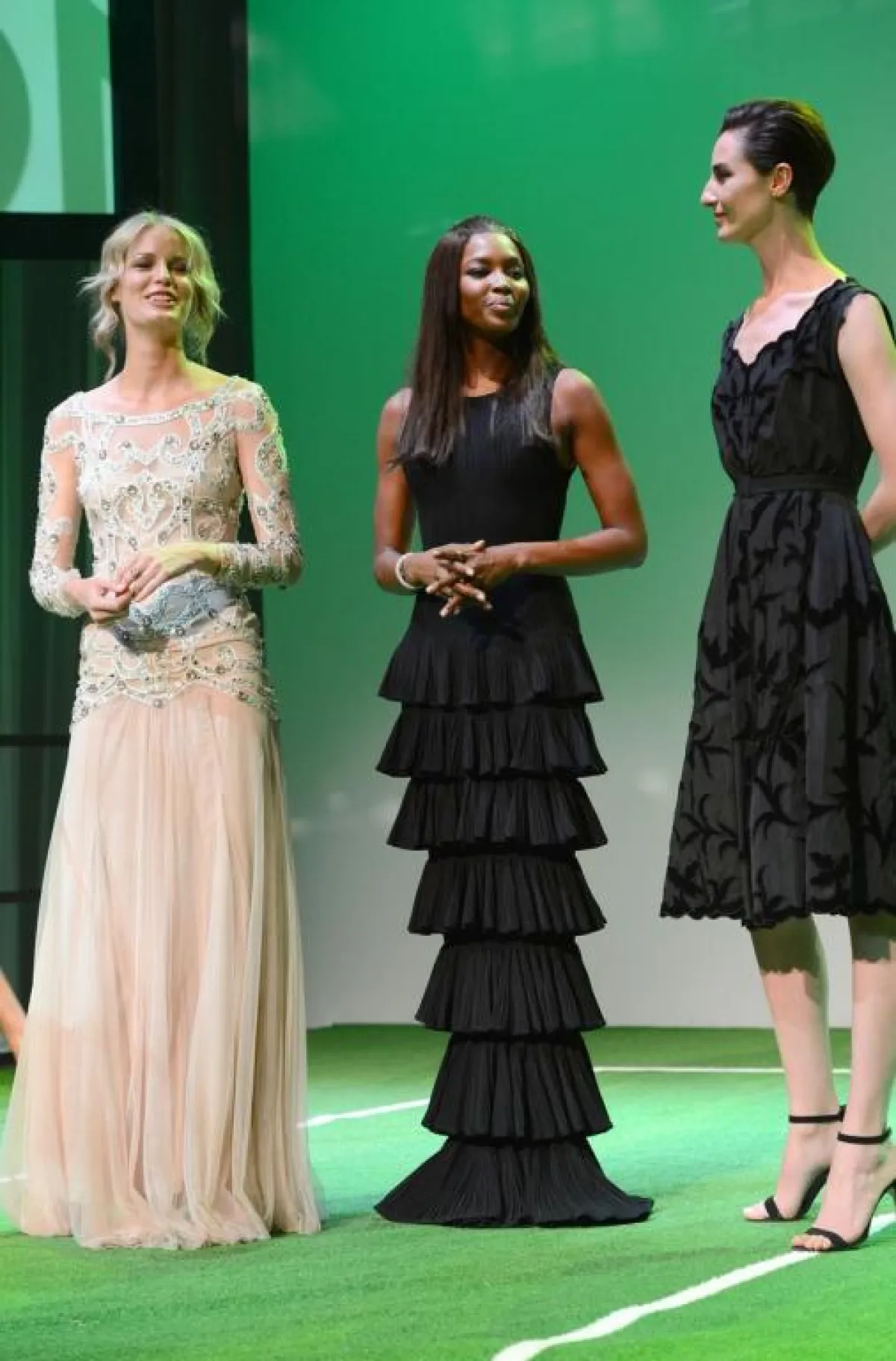 اختارت النجمة فستانًا ناعمًا باللون الرمادي بتصميم ناعم قصير من الأمام وطويل من الخلف، ويبدو أنه كان مريحًا للغاية إذ لم يمنعها من لعب التنس خلال , وقد نسقت Hudson فستانها مع حذاء باللون الأسود من Louboutin . أما صديقة اللاعب Jelena Ristic فقد اختارت فستانًا مخططًا بالأبيض والأسود من تصميم Oscar de la Renta. وبالنسبة لعارضة الأزياء الجميلة السمراء Naomi Campbell فقد اختارت فستانًا أسود طويلًا حمل توقيع المصمم عز الدين العليا ..
