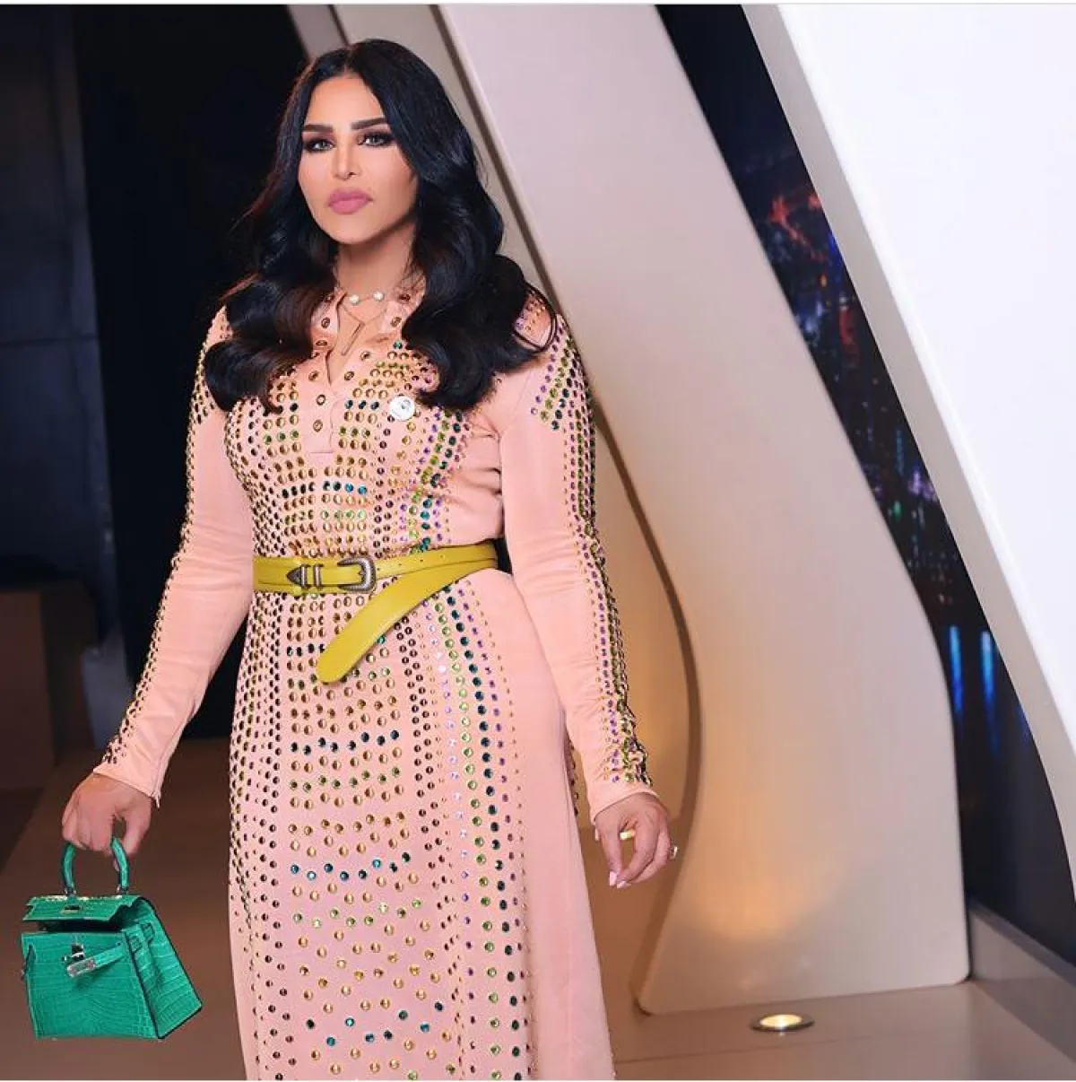 الفساتين الطويلة الضيقة قليلًا نادرًا ما تعتمد عليها الملكة، إلا أنها بدت في هذا الفستان بدرجة النيود، مع حزام الخصر باللون الأخضر الفاتح، أنيقة وجذابة، وجاء تنسيق الألوان غريبًا لكن متناسق باختيارها شنطة باللون الفيروزي من هرمس Hermes.