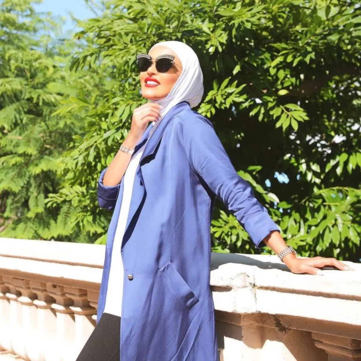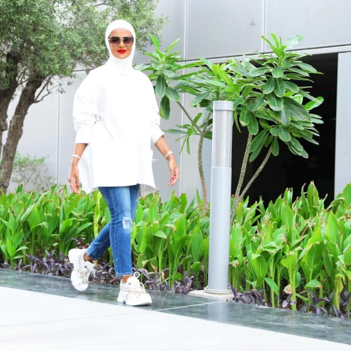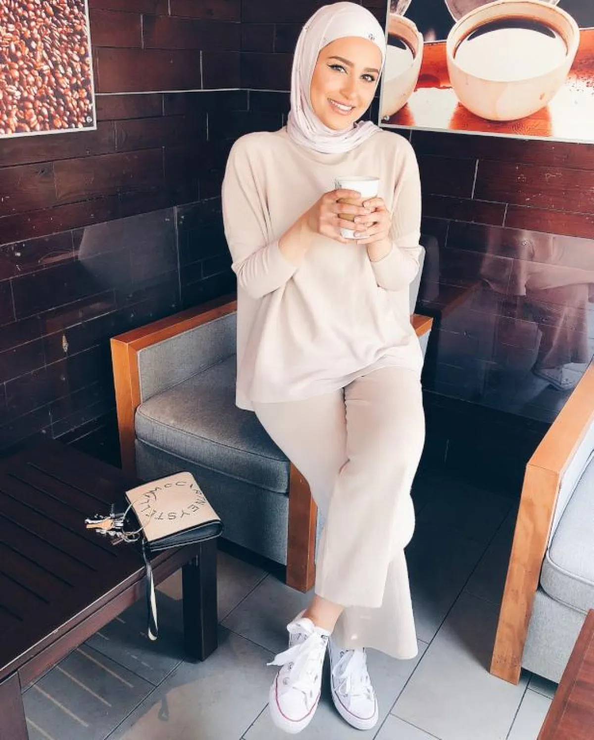 ظهرت المدونة المحجبة مرمر بإطلالة كاجوال تعتمد على سويت شيرت قطني فضفاض مع جينز سكيني وحذاء رياضي، واختارت اللون الأبيض مع الأزرق لتبدو الإطلالة هادئة تناسب الحجاب، يمكنكِ اعتماد نفس الإطلالة بالألوان المفضلة لكِ.