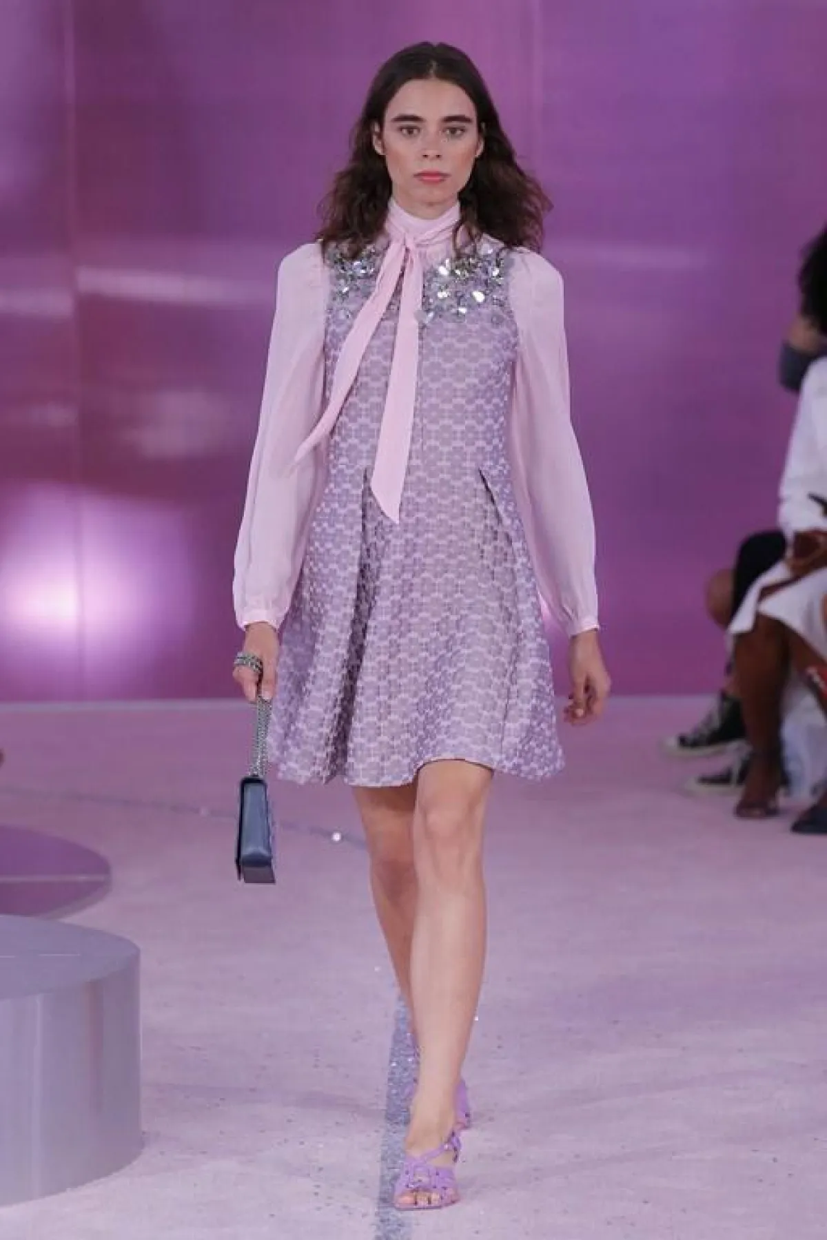 تألقت بريانكا تشوبرا بفستان "بابل دوت" بالياقة المرتفعة واللون الرمادي مع حقيبة "أميليا فلورال سبيد" باللون الذهبي الباهت