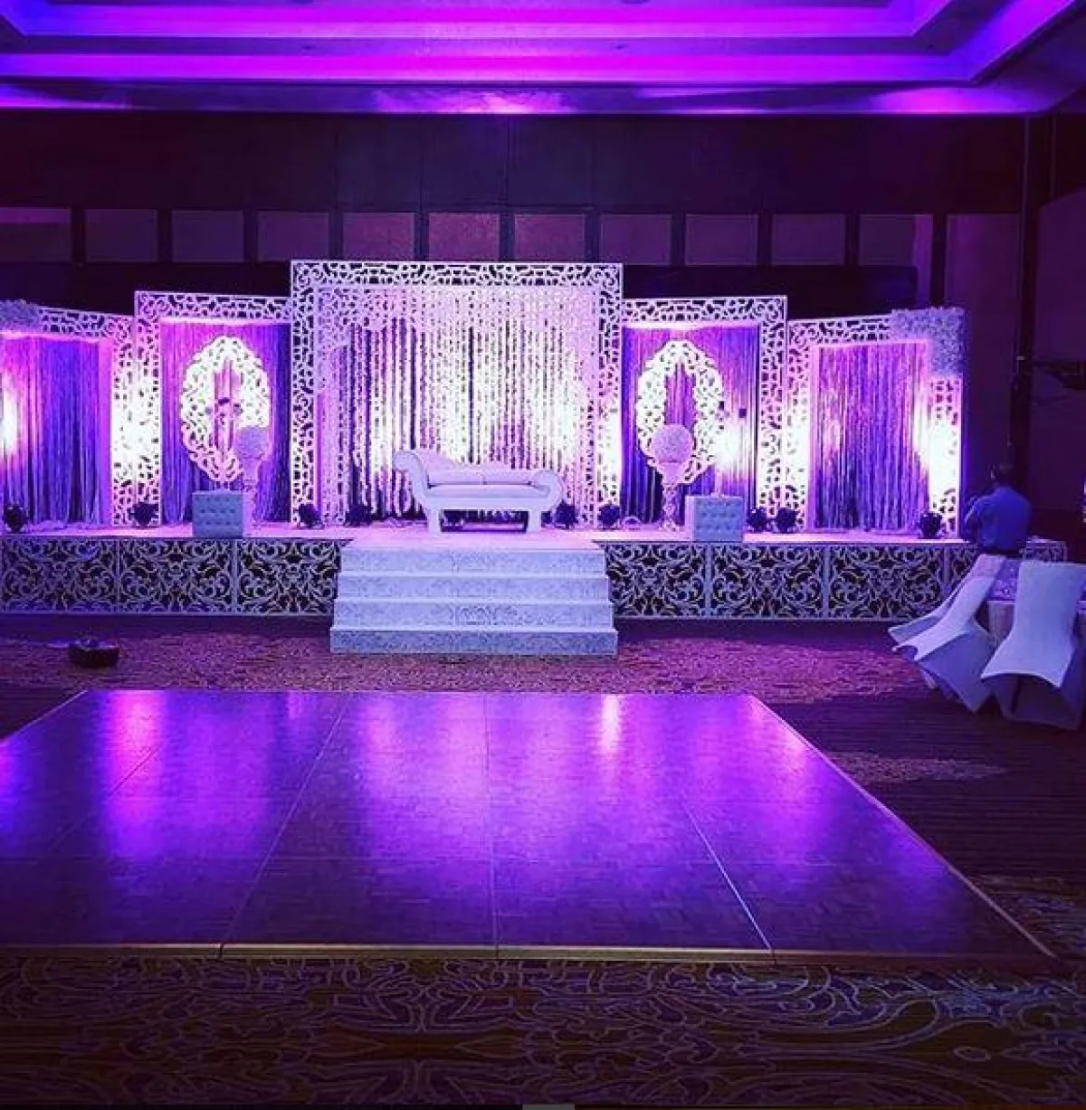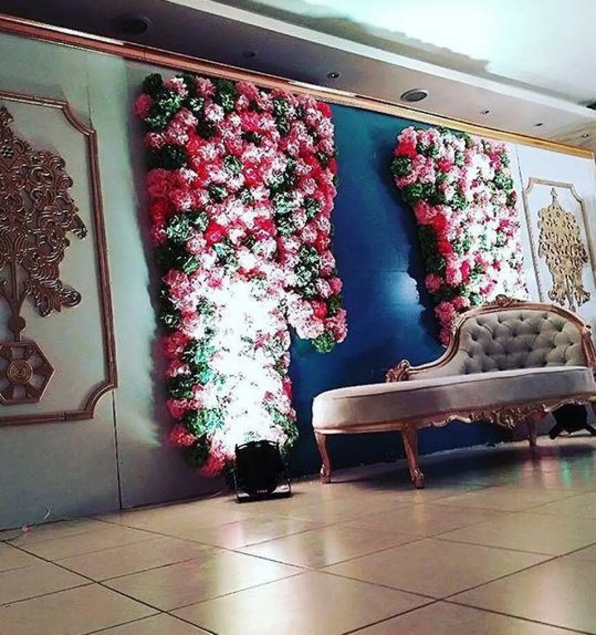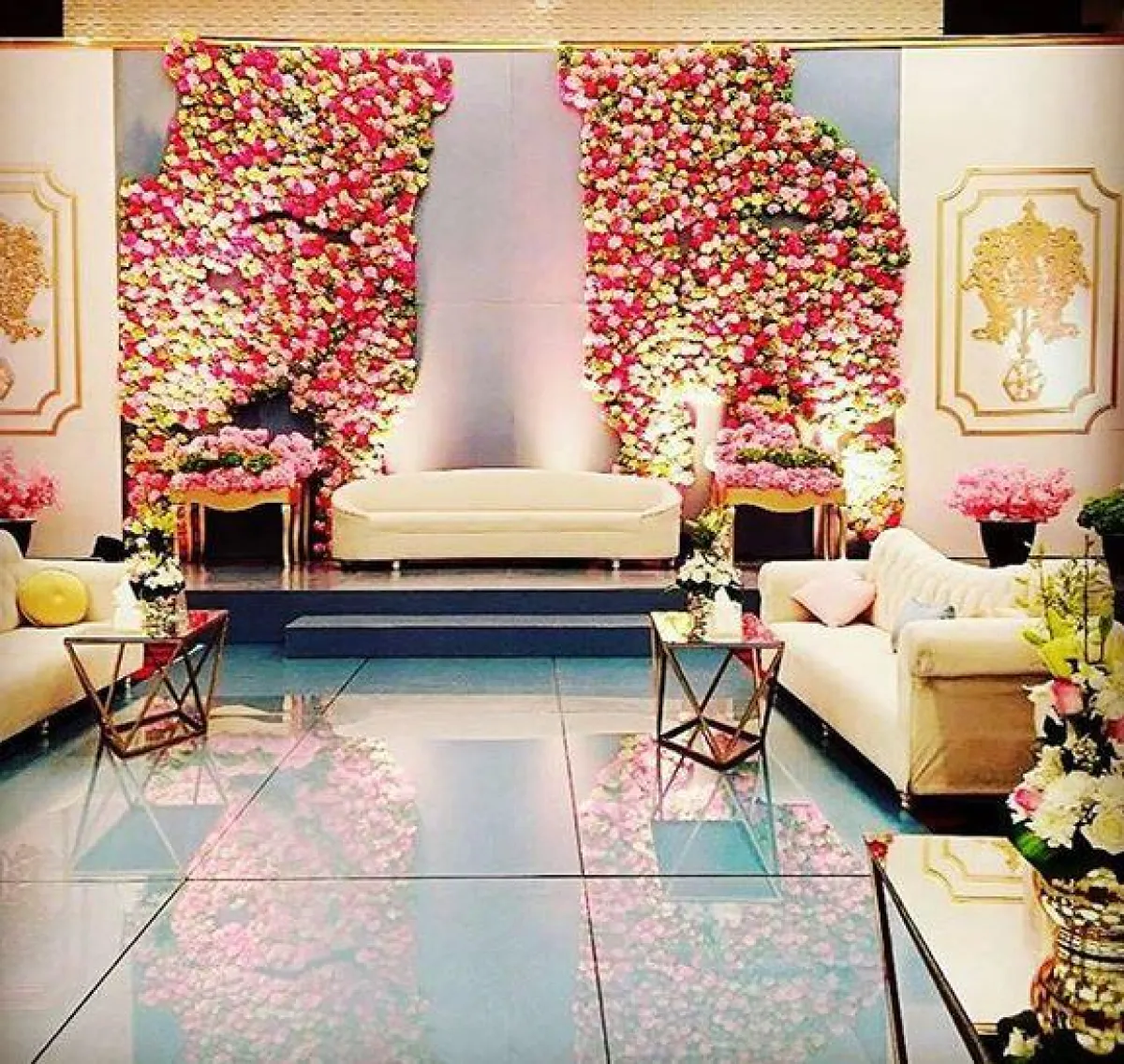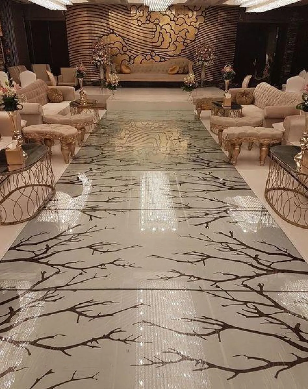 * يفضّل أن تكون الأرضية مكسوة بالسجاد، وأن تكون بارتفاعات مختلفة ليتمكن جميع الحضور من رؤية العروس في "كوشتها"، ومن الهام أن يكون ممشى العروس بارزًا لتحقيق نفس الغاية – رؤية جميع الحضور لها.