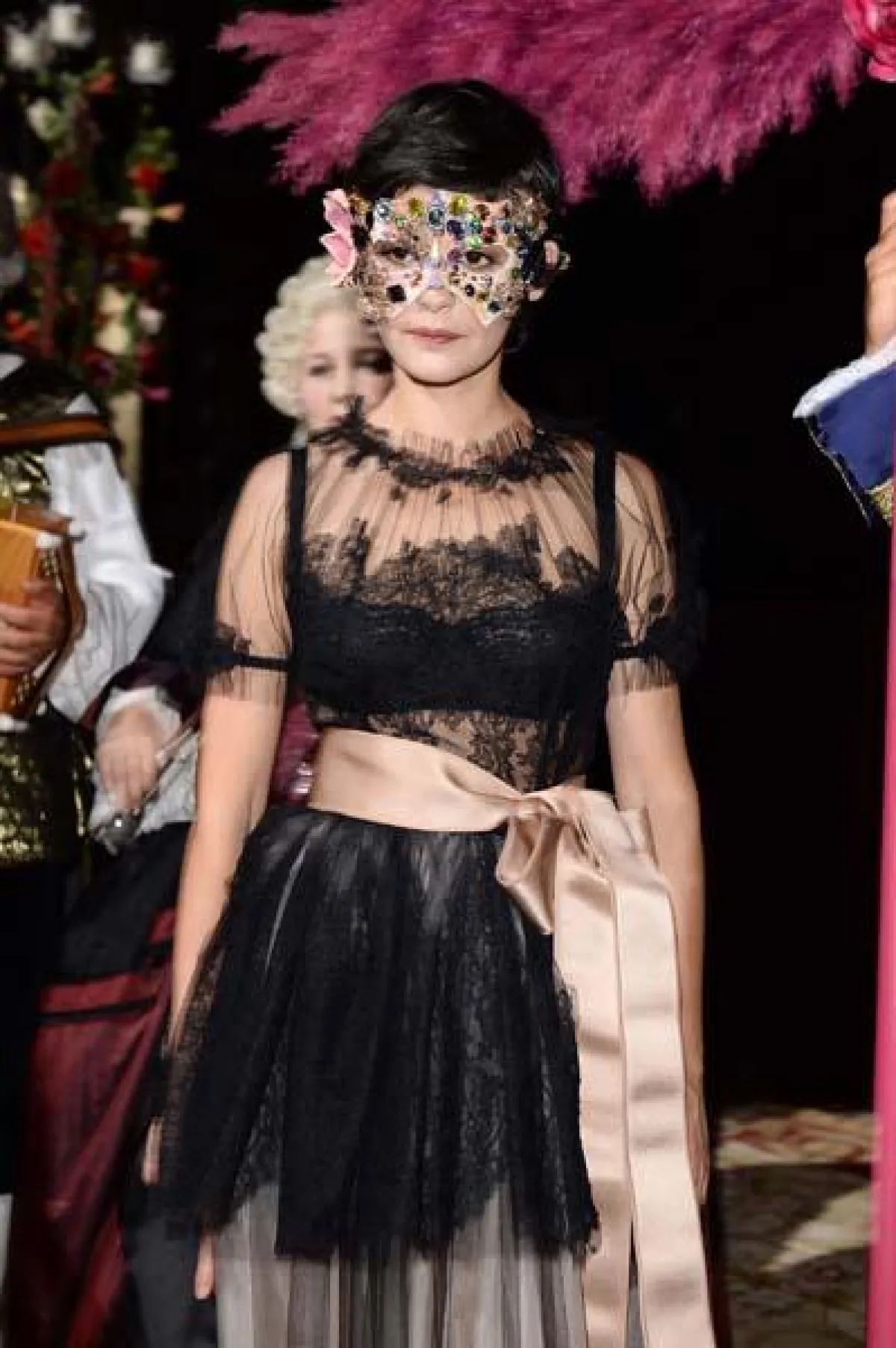 وبالنسبة الممثلة Audrey Tatou فقد ظهرت بإطلالة معقولة إلى حد ما بفستان أسود من الدانتيل مع قناع وردي مرصع بالأحجار الكريمة .