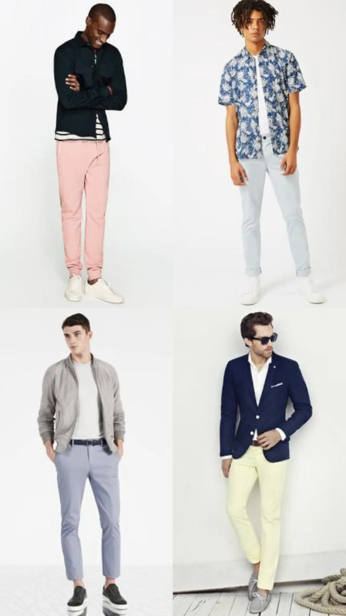 كل الألوان السابقة قد تكون متوافرة بالفعل في خزانة أي رجل، لكن إذا كان يستهدف أن يبدو عصرياً ومتابعاً لصيحات الموضة لهذا العام، فعليه اقتناء بنطلون واحد على الأقل بتدرجات الباستيل، مثل السماوي، الأصفر، الوردي وهكذا.