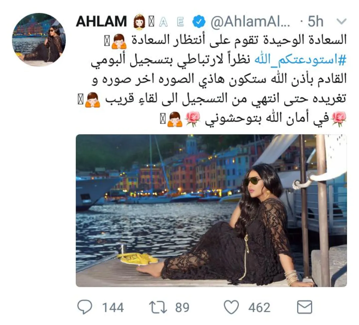 ونشرت أحلام عبر حساباتها على مواقع التواصل الإجتماعي صورة لها وهي ترتدي فستاناً أسود وعلقت عليها" السعادة الوحيدة تقوم على إنتظار السعادة. استودعكم الله نظراً لإرتباطي بتسجيل ألبومي القادم. بإذن الله ستكون هاذي آخر صورة وتغريدة حتى أنتهي من التسجيل إلى لقاء قريب. في أمان الله بتوحشوني".