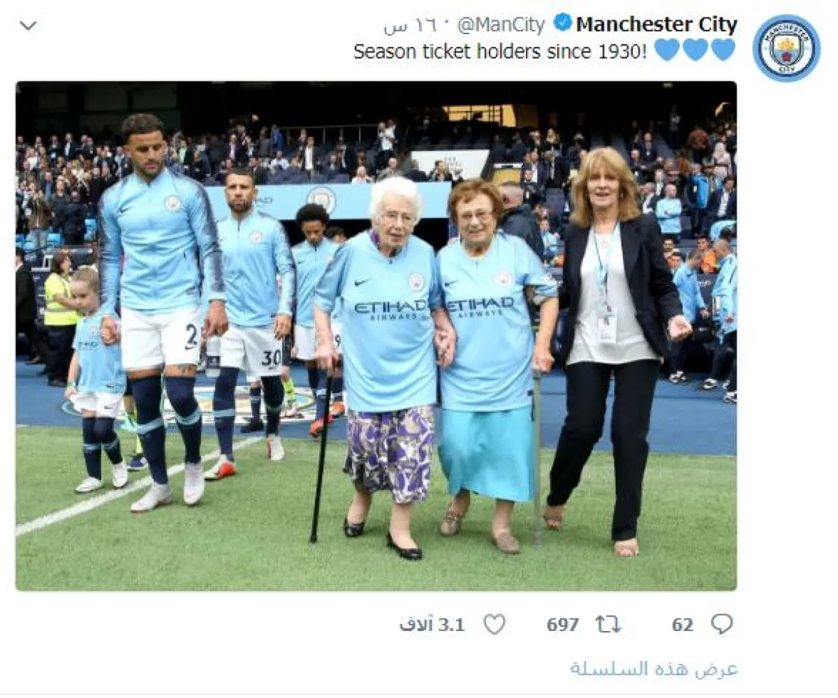 "مانشستر ستي" الإنجليزي يُكرم أقدم مشجعتين له منذ العام 1930