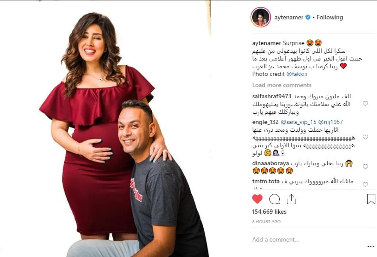 آيتن التي ظهرت في ماراثون دراما رمضان 2018 بمسلسل "أيوب" دون أن تظهر عليها علامات الحمل، وقامت بتصوير فيلم "بيكيا" مع النجم محمد رجب دون أن يلاحظ زملاؤها بروز البطن، كشفت السر عبر حسابها الموثق بموقع إنستقرام، ونشرت صورة برفقة زوجها وهي في الأيام الأخيرة من الحمل وعلقت عليها قائلة: "شكرا لكل اللى كانوا بيدعولى من قلبهم حبيت اقول الخبر فى اول ظهور اعلامى بعد ما ربنا كرمنا ب يوسف محمد عز العرب".