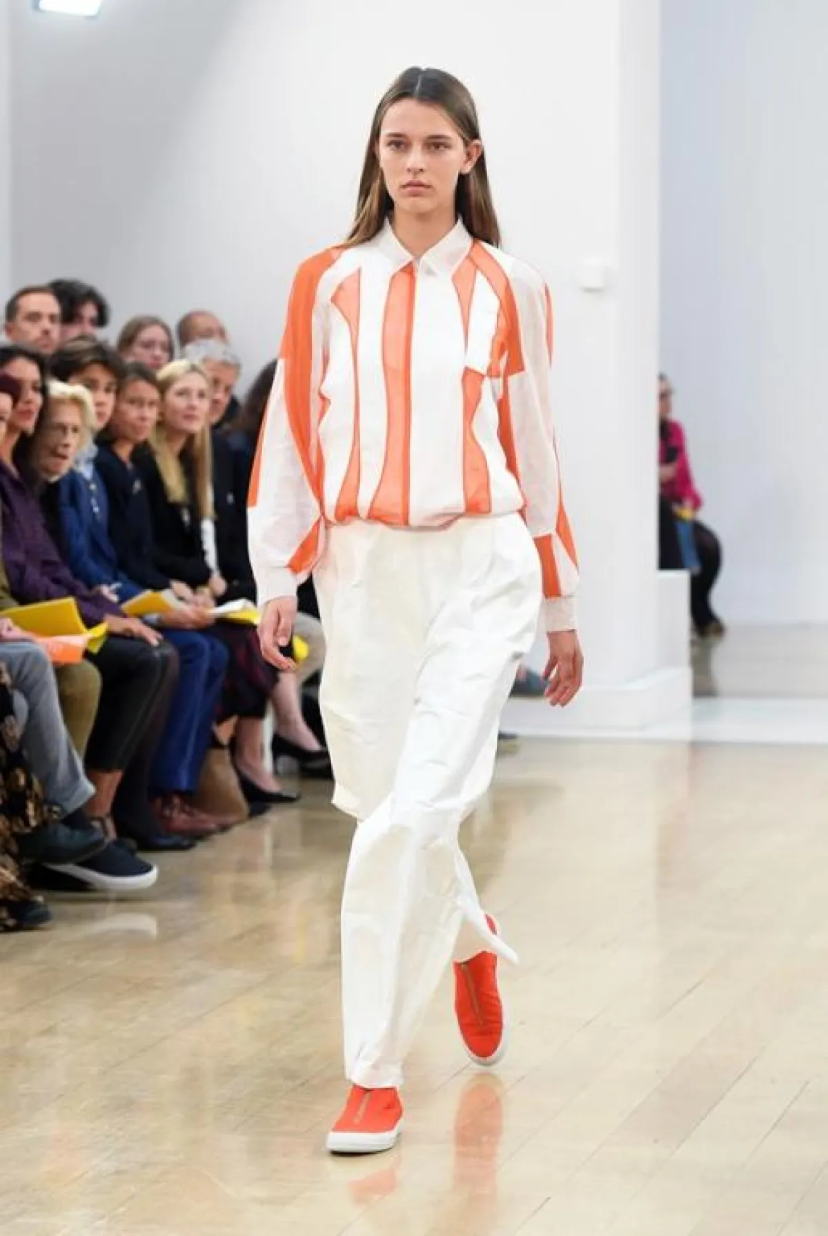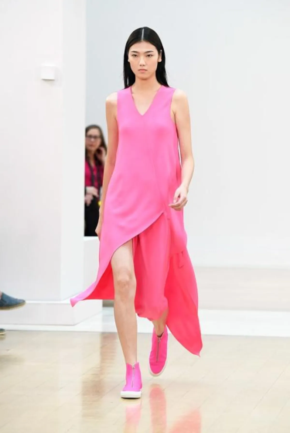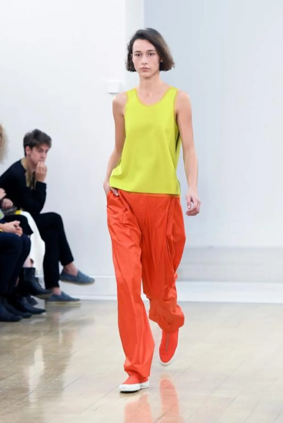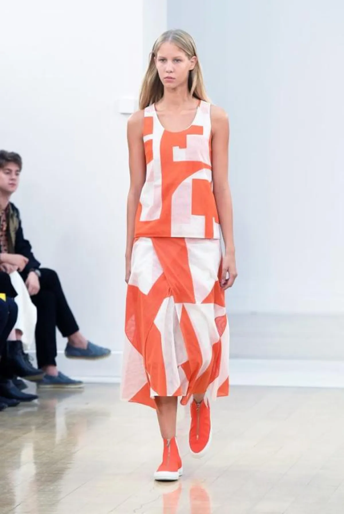 وفي هذا العرض لاحظنا تركيزاً على لوني البرتقالي والأخضر مع استعمال ذكي للخامات المطواعة مثل القطنية والجلدية الرقيقة فيما انتعلت عارضاته أحذية رياضية خفيفة بألوان تنسجم بشكل كبير مع ألوان الثياب وتشكلان معاً توليفة شبابية جميلة ، فيما ظهرت أيضاً بعض الفساتين البيضاء والفضية اللماعة للمشاوير المسائية, وكان موفقاً إلى حد كبير في تقديم ثياب ناعمة تلعب على ثنائية الأسود والأبيض .