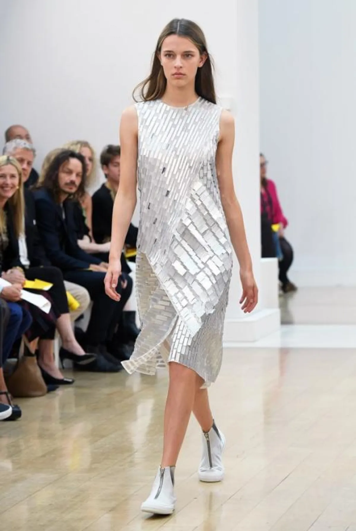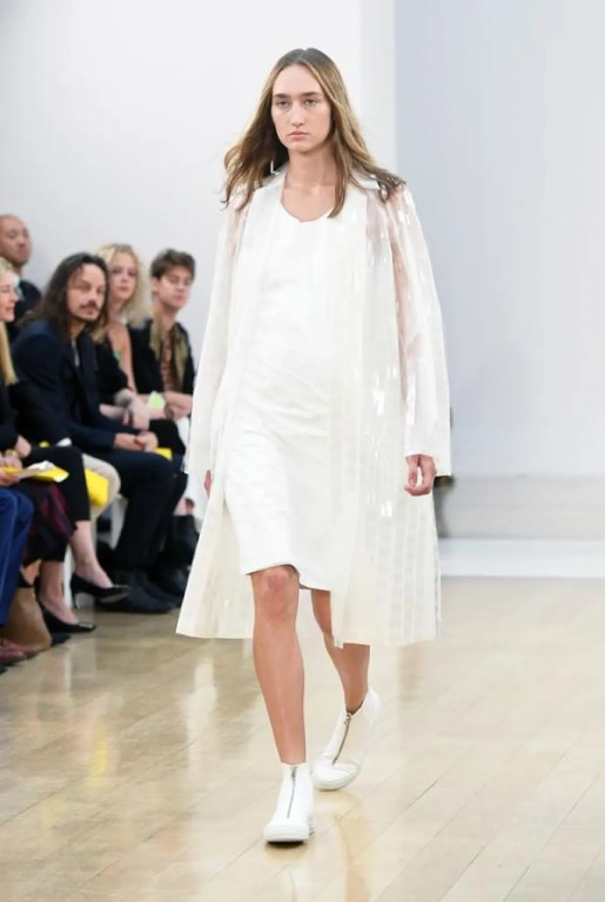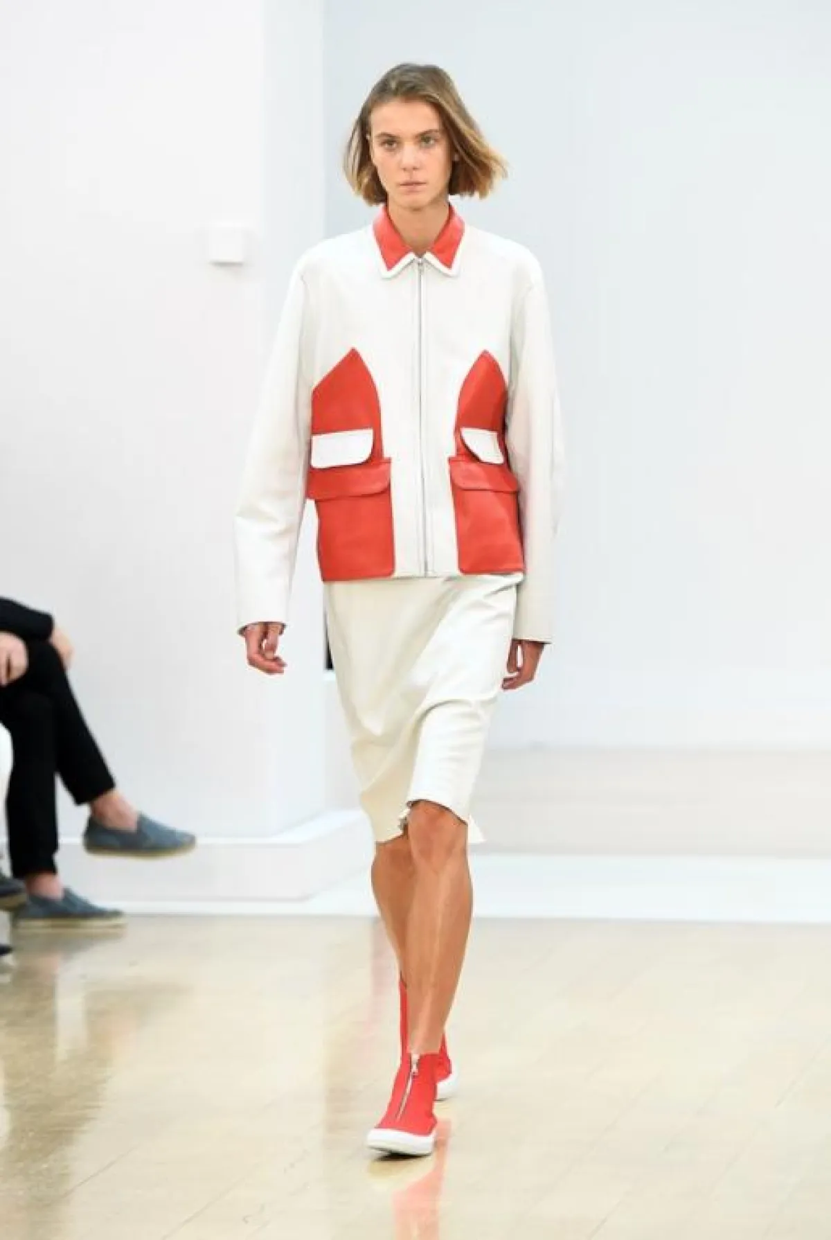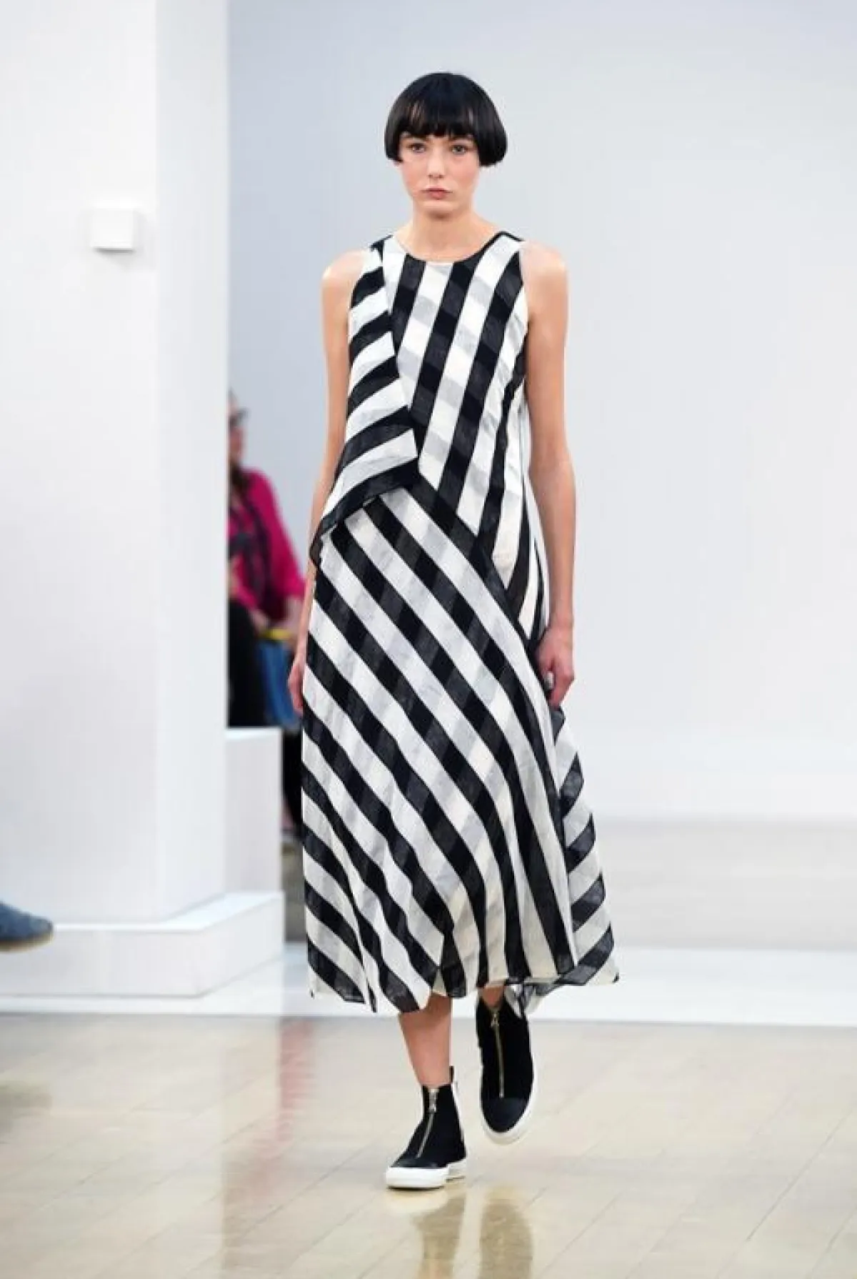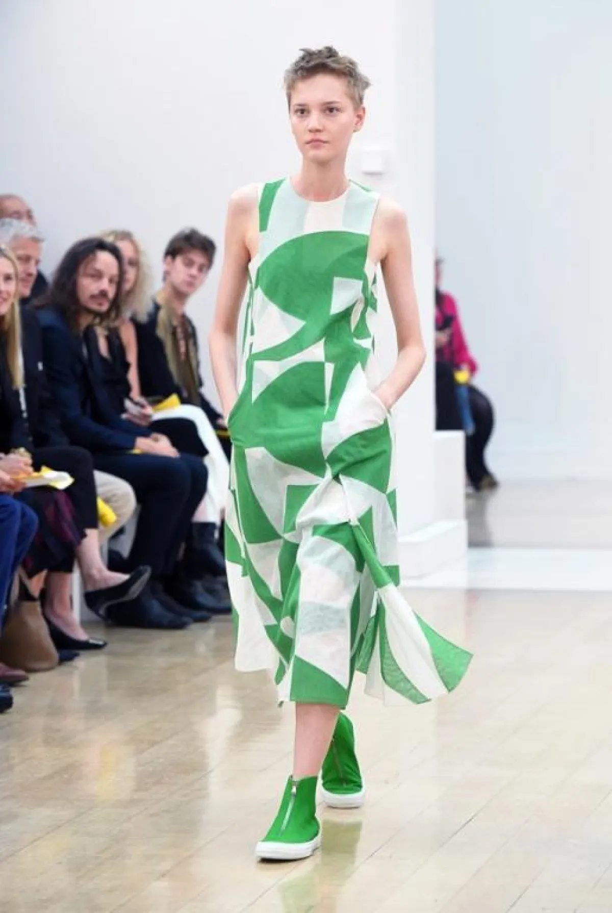 وفي هذا العرض لاحظنا تركيزاً على لوني البرتقالي والأخضر مع استعمال ذكي للخامات المطواعة مثل القطنية والجلدية الرقيقة فيما انتعلت عارضاته أحذية رياضية خفيفة بألوان تنسجم بشكل كبير مع ألوان الثياب وتشكلان معاً توليفة شبابية جميلة ، فيما ظهرت أيضاً بعض الفساتين البيضاء والفضية اللماعة للمشاوير المسائية, وكان موفقاً إلى حد كبير في تقديم ثياب ناعمة تلعب على ثنائية الأسود والأبيض .