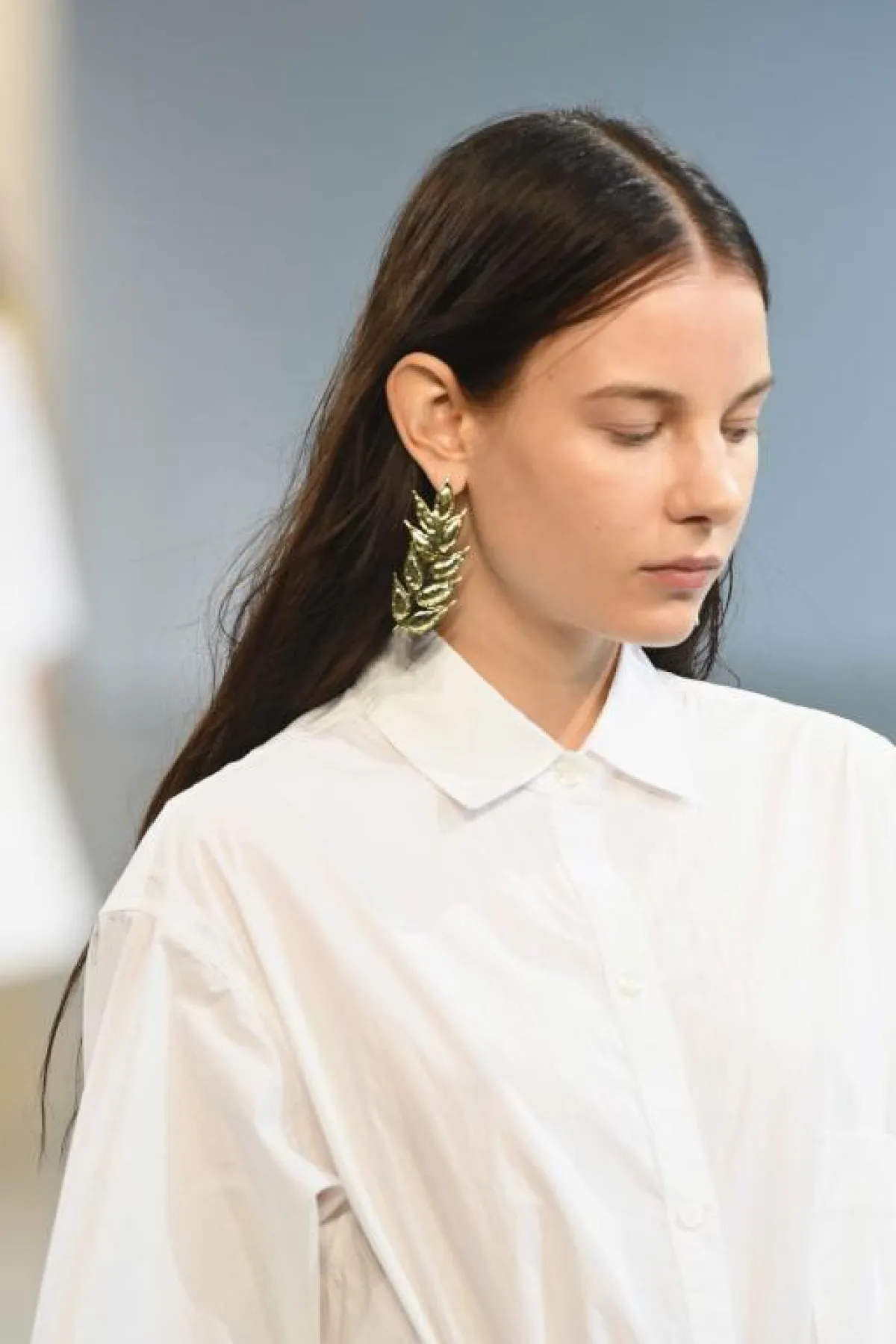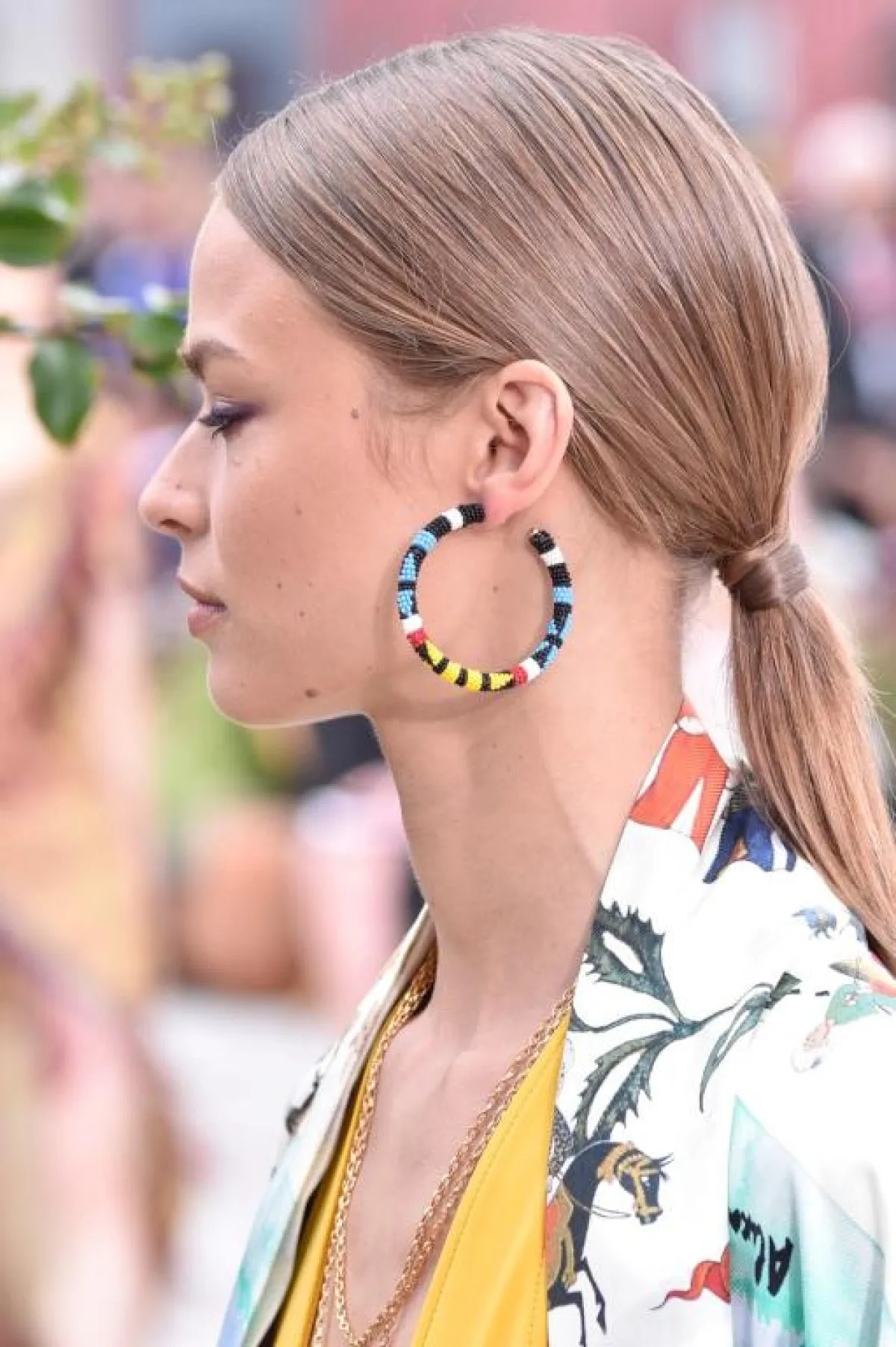 ولكن إن كان الفستان بخامة الستان الحريري، منسدلًا من دون أكمام، أو بأكمام مع رقبة عالية، اجعلي هذا القرط كبير الحجم باللون الذهبي الباهت، هو عنوان أناقتكِ مع الشعر الذهبي، من Carolina Herrera كارولينا هيريرا.