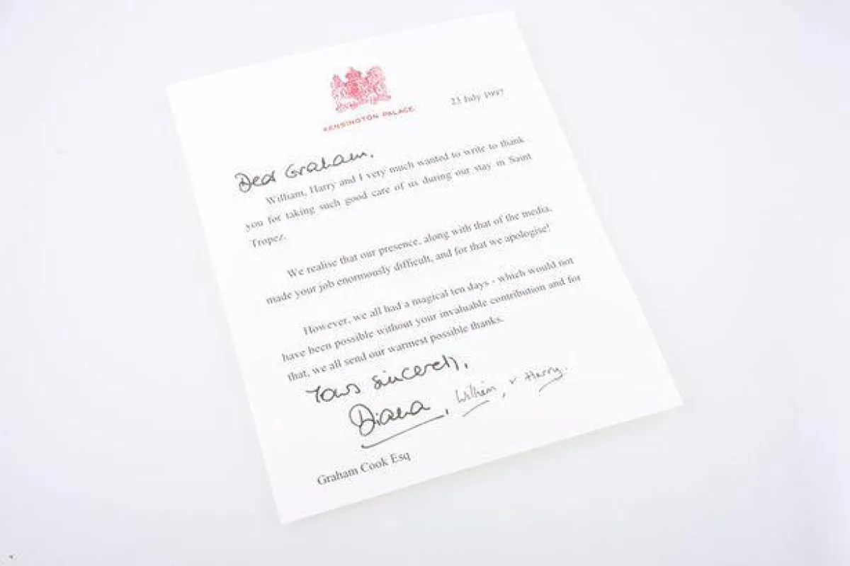 وتضمنت الرسالة التي وجهتها لحارسها غراهام كوك، وهو عنصر في الفريق الأمني المسؤول عن حماية العائلة المالكة طيلة أيام عطلهم في أحد منازل والد دودي الفايد الذي يقع في مدينة سان تروبيه جنوب فرنسا- شكرها وولديها له على الأيام الرائعة التي قضتها، والتي تقول إنه ما كان من الممكن أن تكون العطلة رائعة دونه، كما اعتذرت له مشيرة إلى تفهّمها لمدى صعوبة وظيفته بسبب مركز العائلة الاجتماعي ووسائل الإعلام.