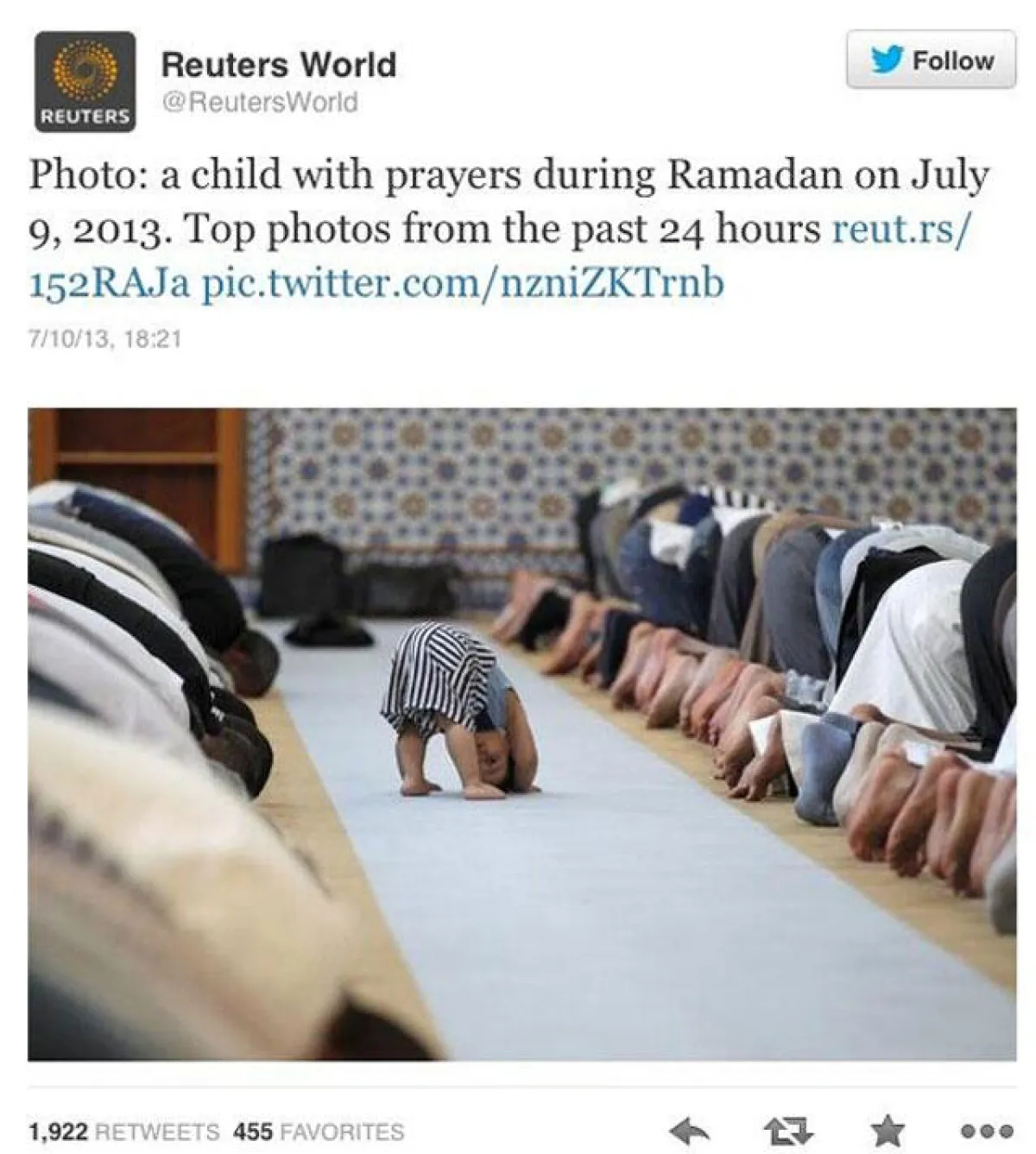 تمّ اختيار صورة لطفل يقوم بتقليد المصلّين، في مسجد بمدينة ستراسبورغ في فرنسا، كأفضل صورة في العالم، في اليوم الأول من أمس، من قبل وكالة الأخبار العالميّة "رويترز".
