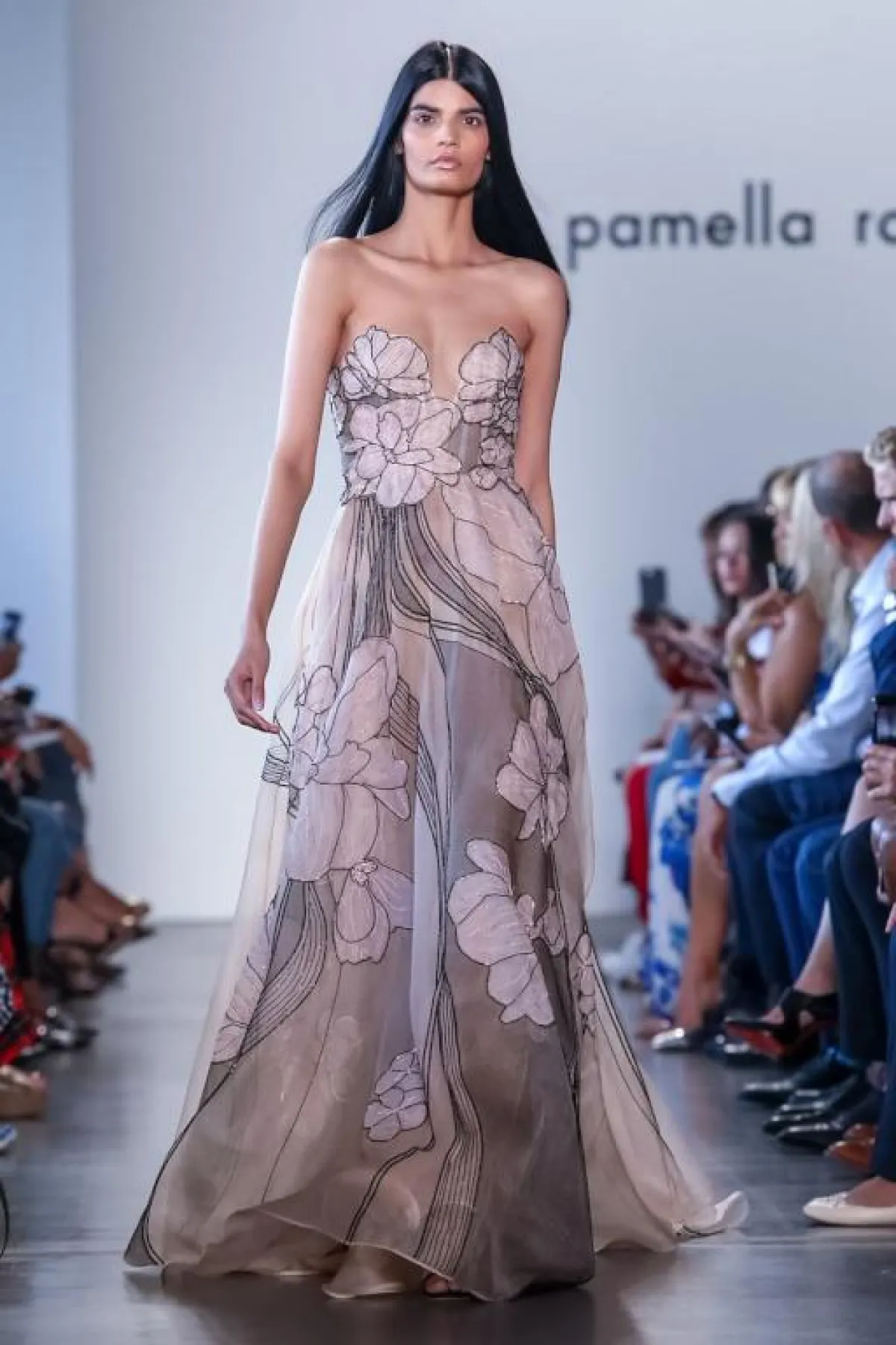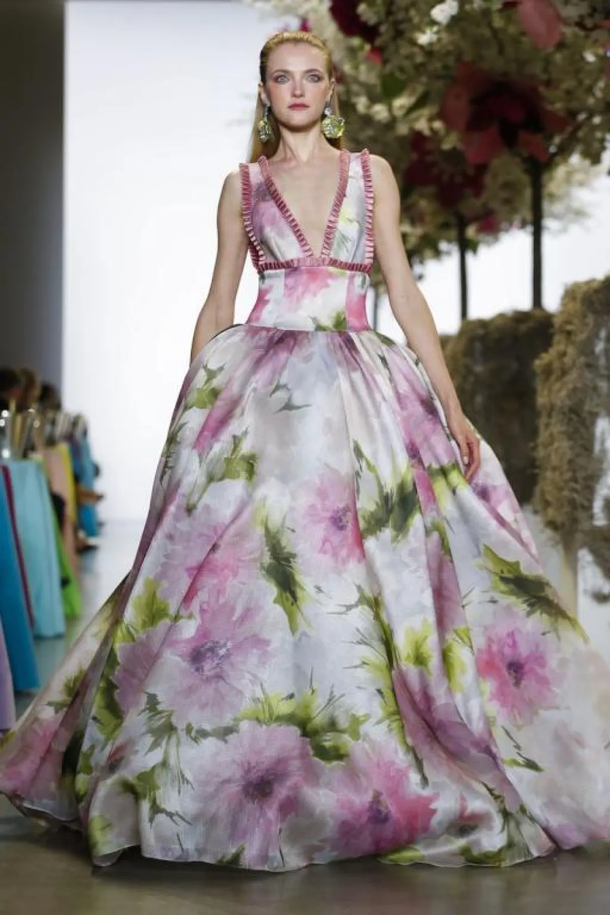 تزينت كثير من الموديلات بطبعات الورود الملونة، وهي من أجمل الصيحات التي تناسب عروس الصيف، فتبدو الفساتين عصرية ومبهجة بألوانها الحيوية، مثل فساتين زفاف بادجلي ميشكا Badgley Mischka، وباميلا رولان Pamella Roland.