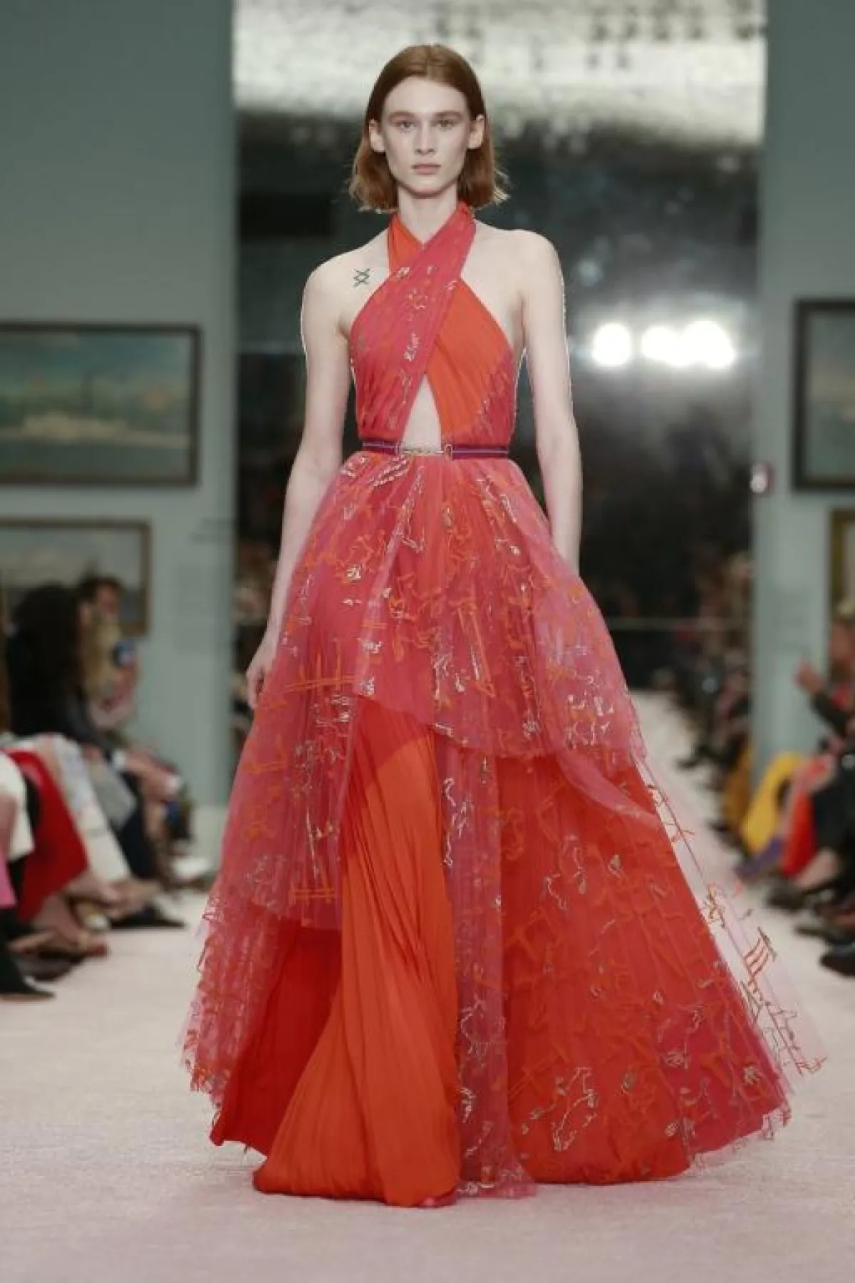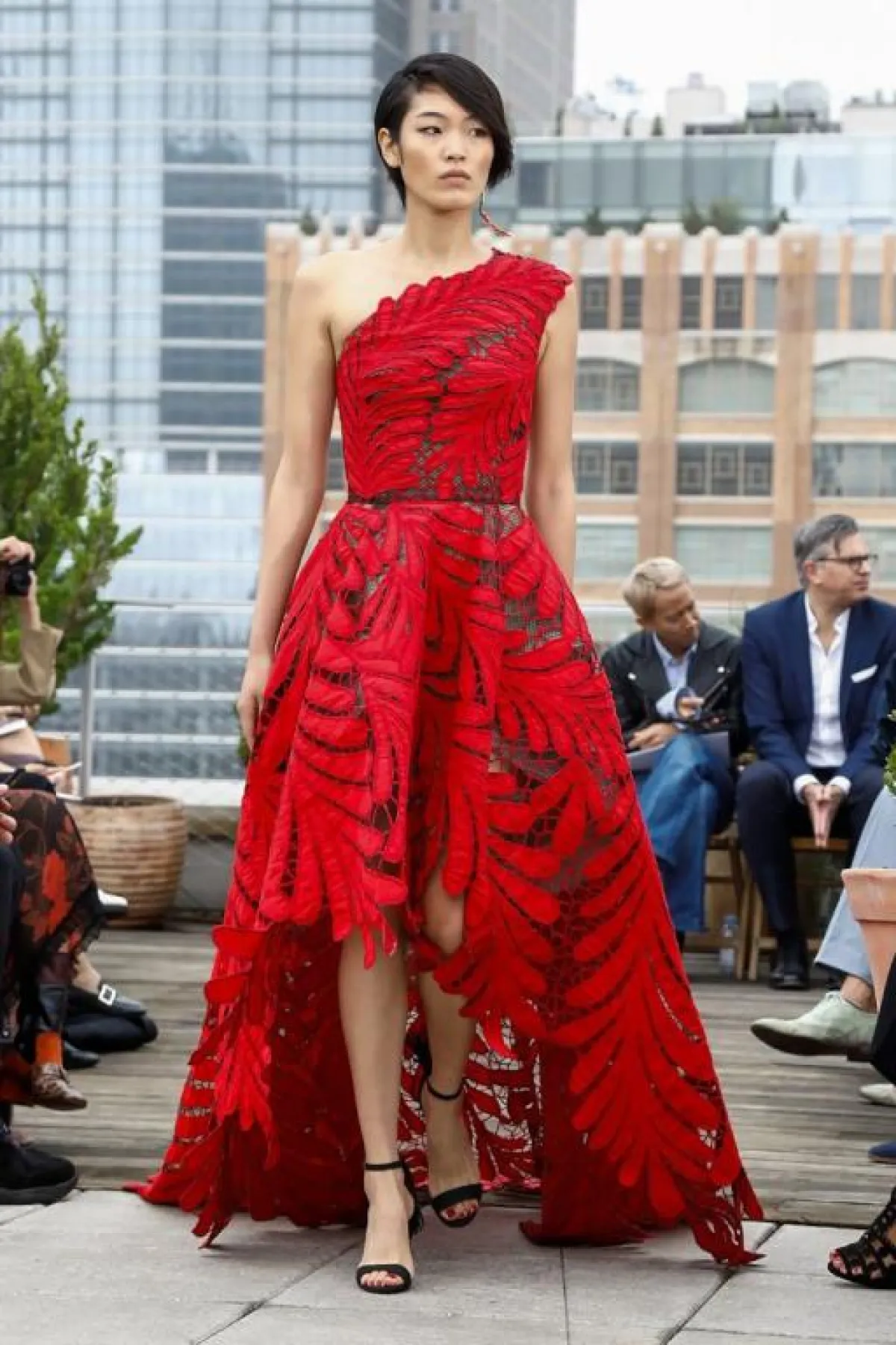 كما قدمت دار أوسكار دى لارنتا Oscar de la Renta فستاناً مميزاً باللون الأحمر وبقصّة الكتف الواحد One Shoulder مع تنورة High Low، وهو من الصيحات المميزة التي يمكن أن تعتمدها العروس يوم الخطوبة.