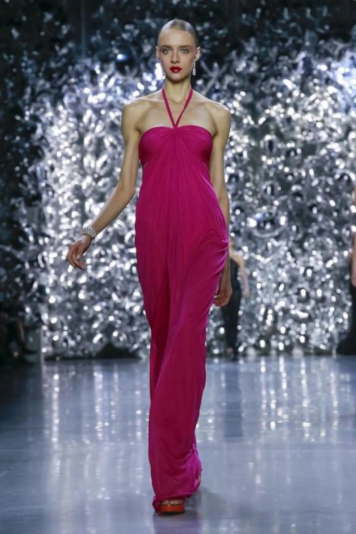 أيضاً ظهر اللون الوردي بدرجته القوية والحيوية في بعض العروض، مثل الفستان البسيط بالحمّالة حول الرقبة من نعيم خان Naeem Khan.